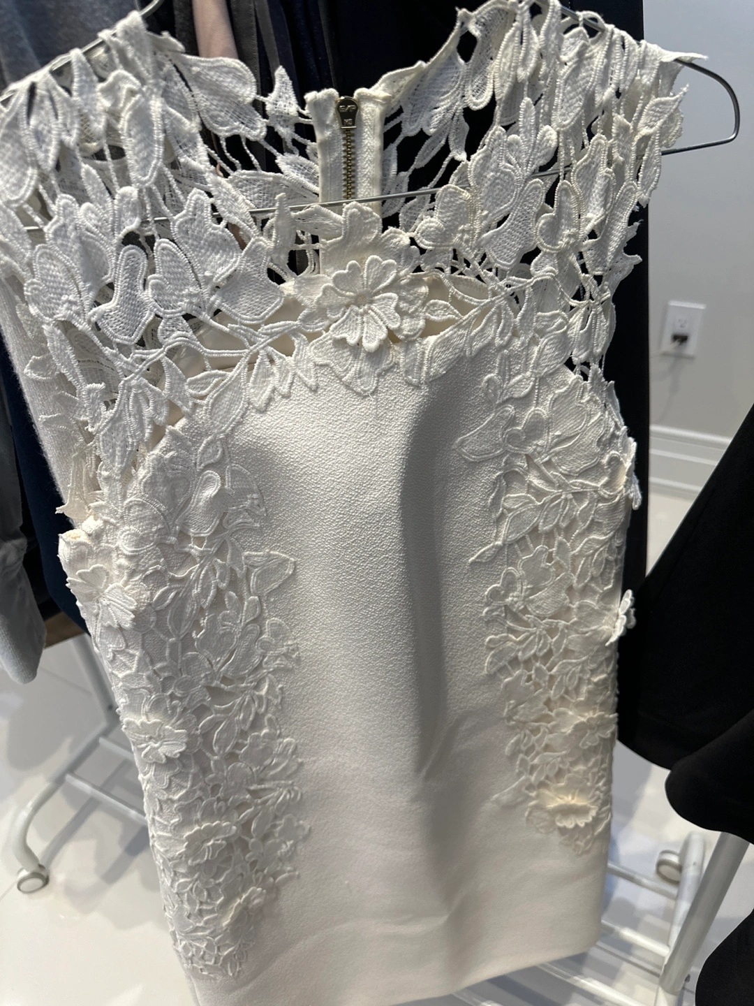 67Elegant sleeveless dress. Features beautiful floral lace overlay. Fitted silhouette. Back zipper closure.