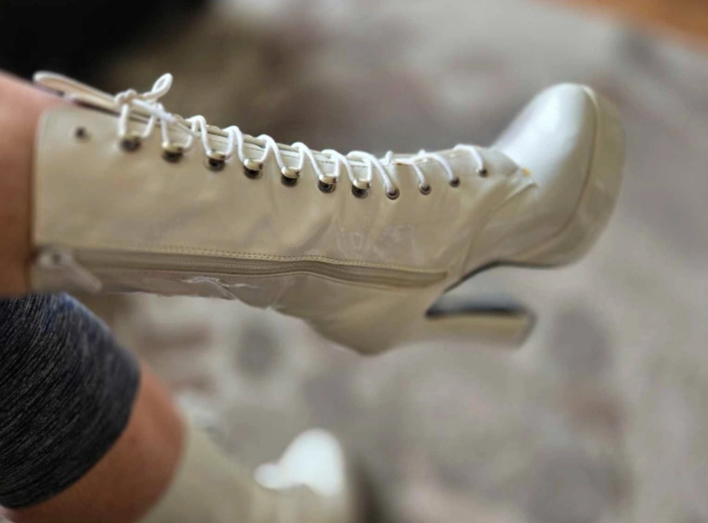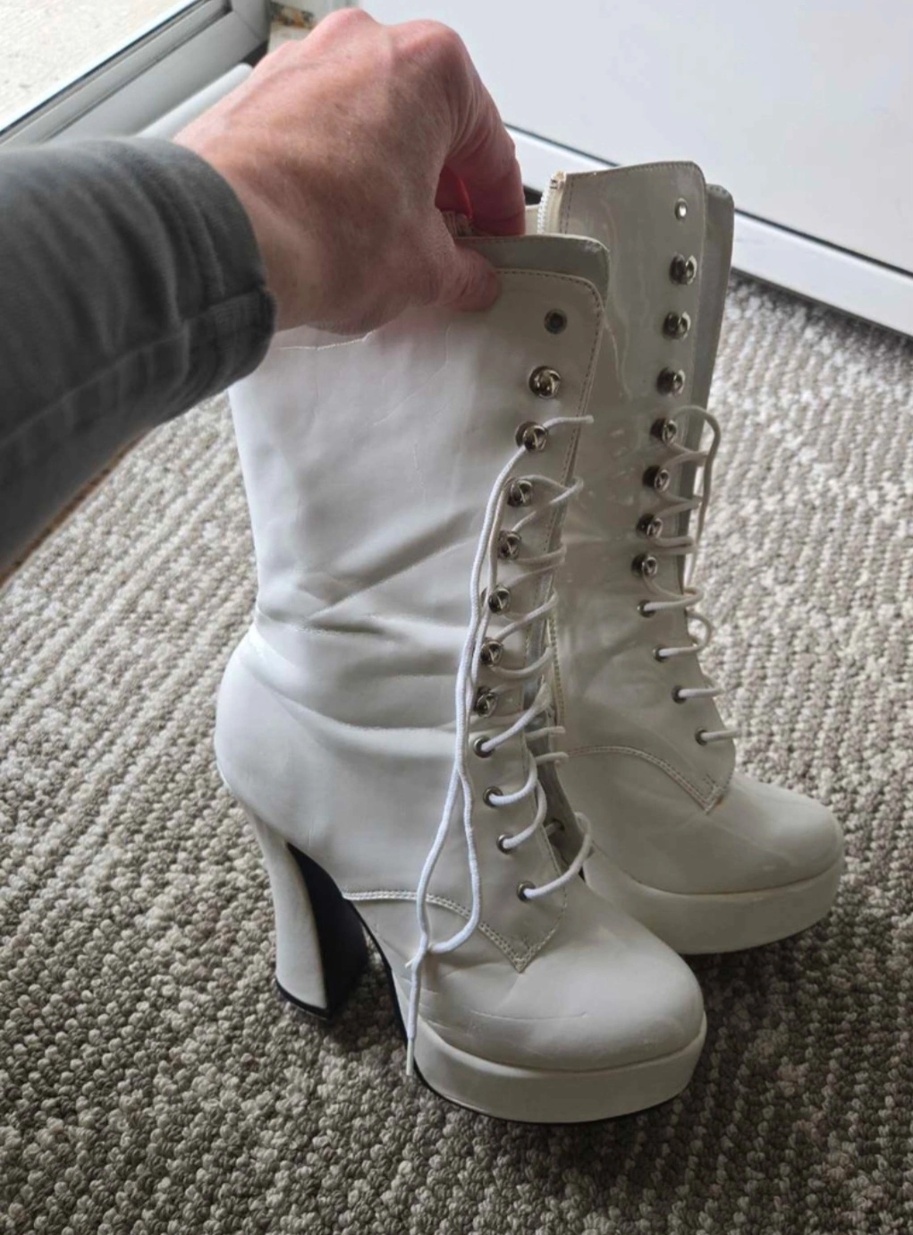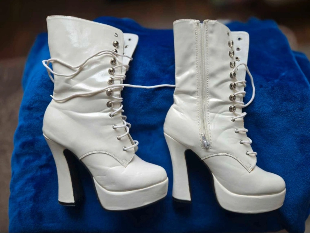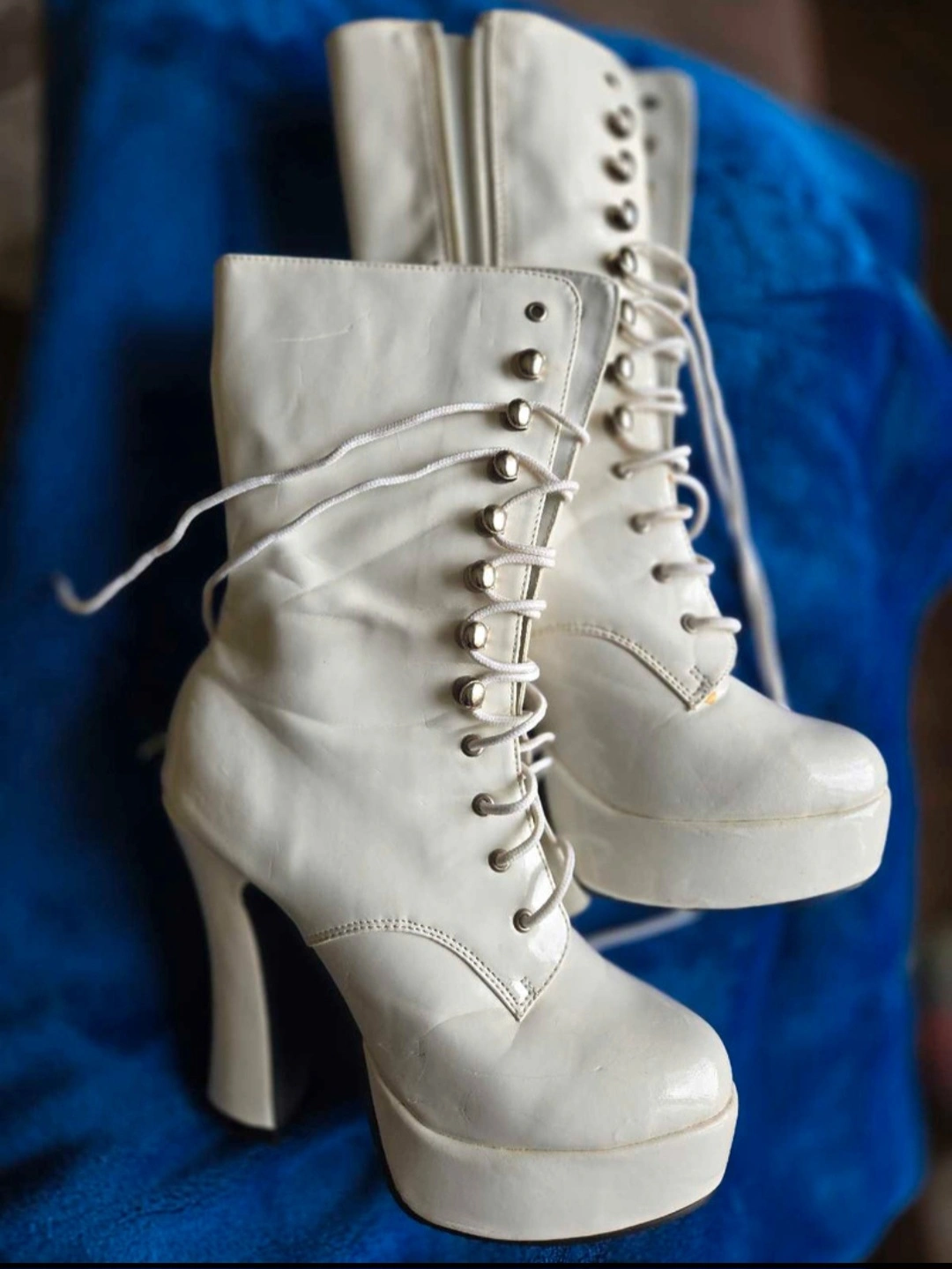 These retro, costume style white, lace-up platform boots are sure to make a statement! They feature a high heel and a front lace-up design, with a zipper on the side for easy wear. Perfect for any costume! Women's Size 8