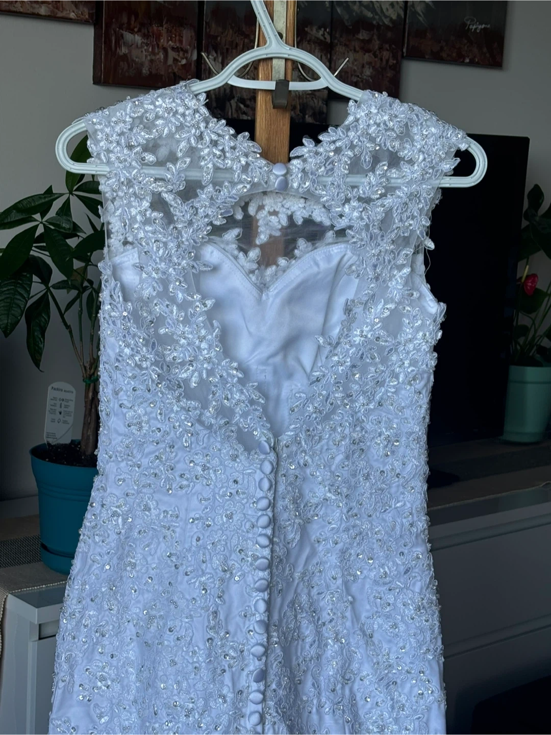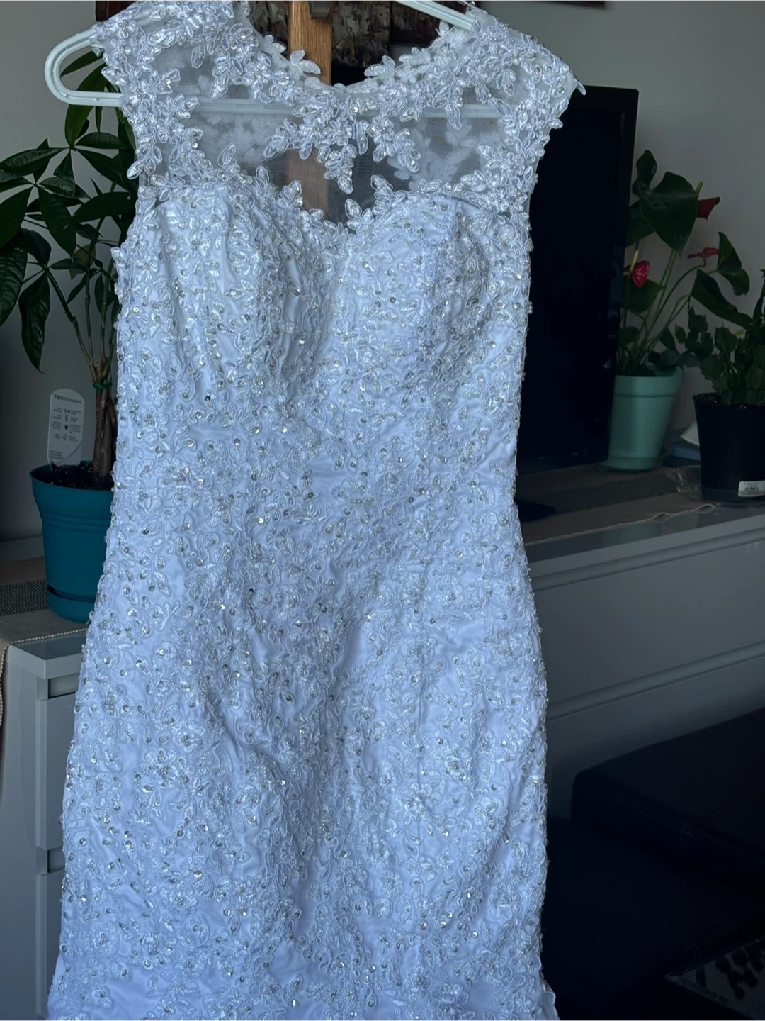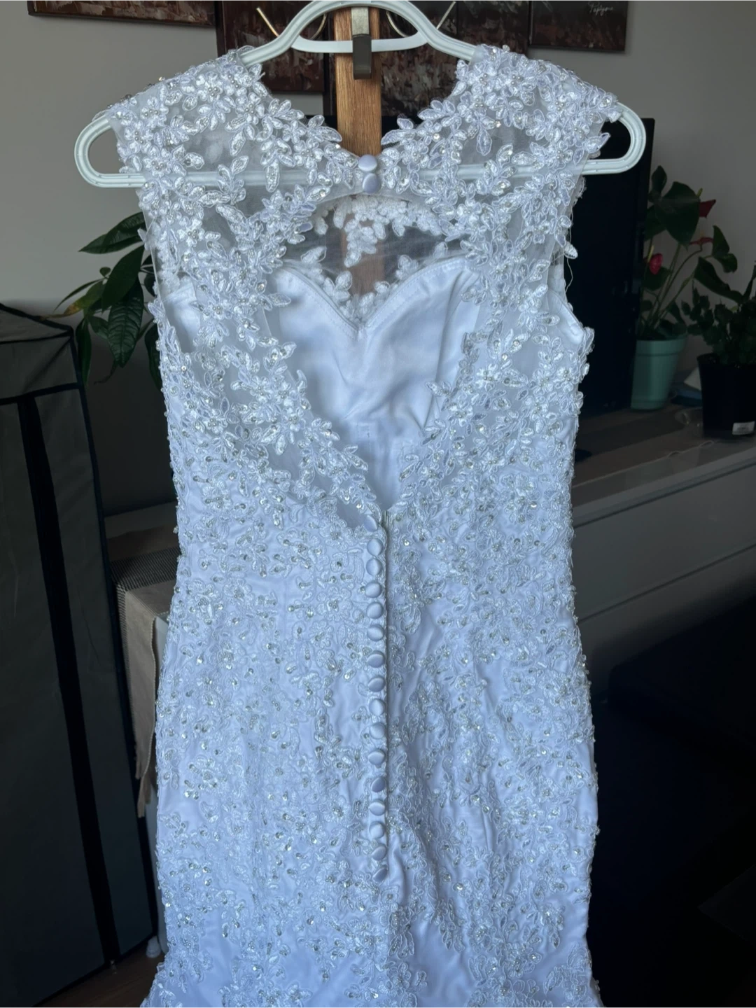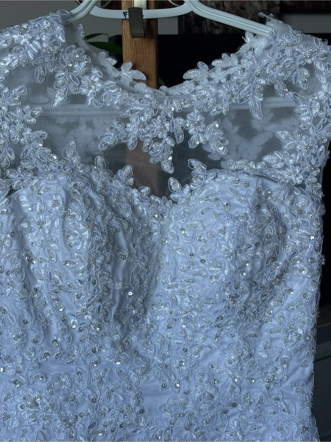 Beautiful white wedding dress with intricate lace detailing. Perfect for your special day!