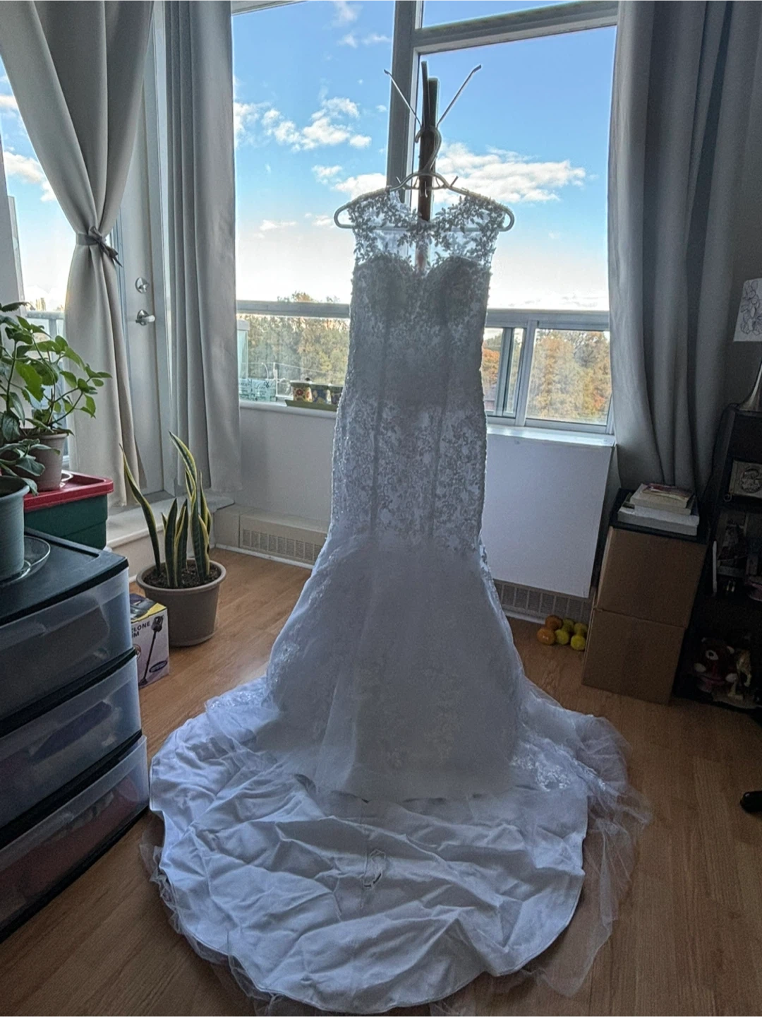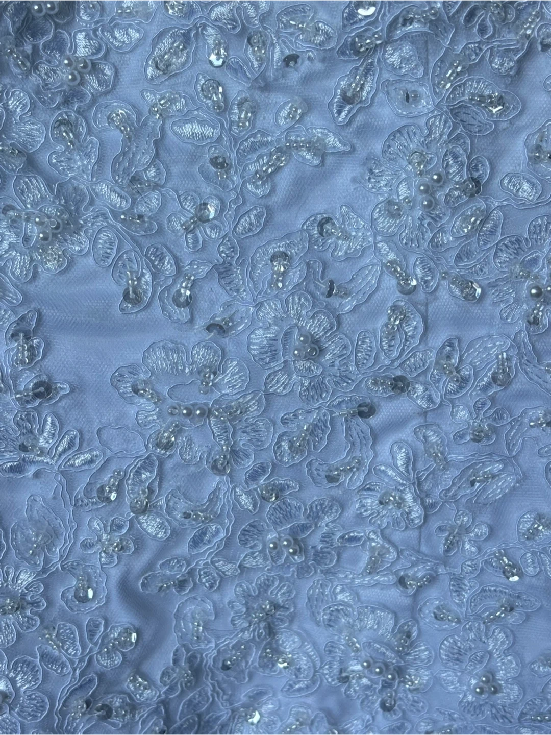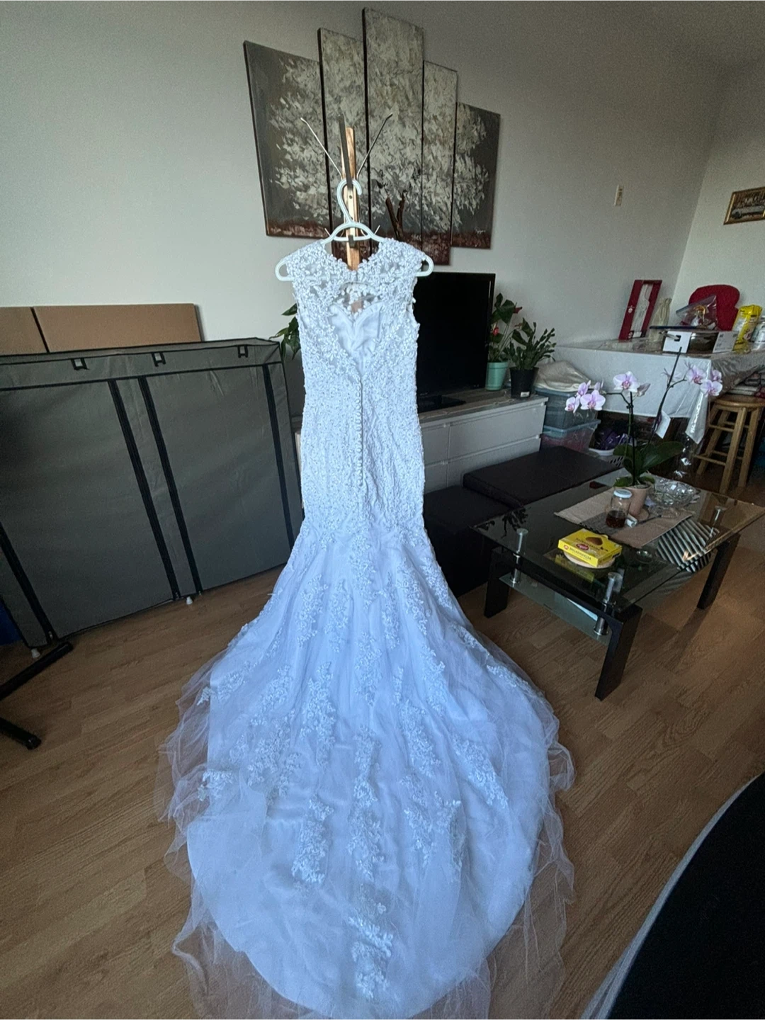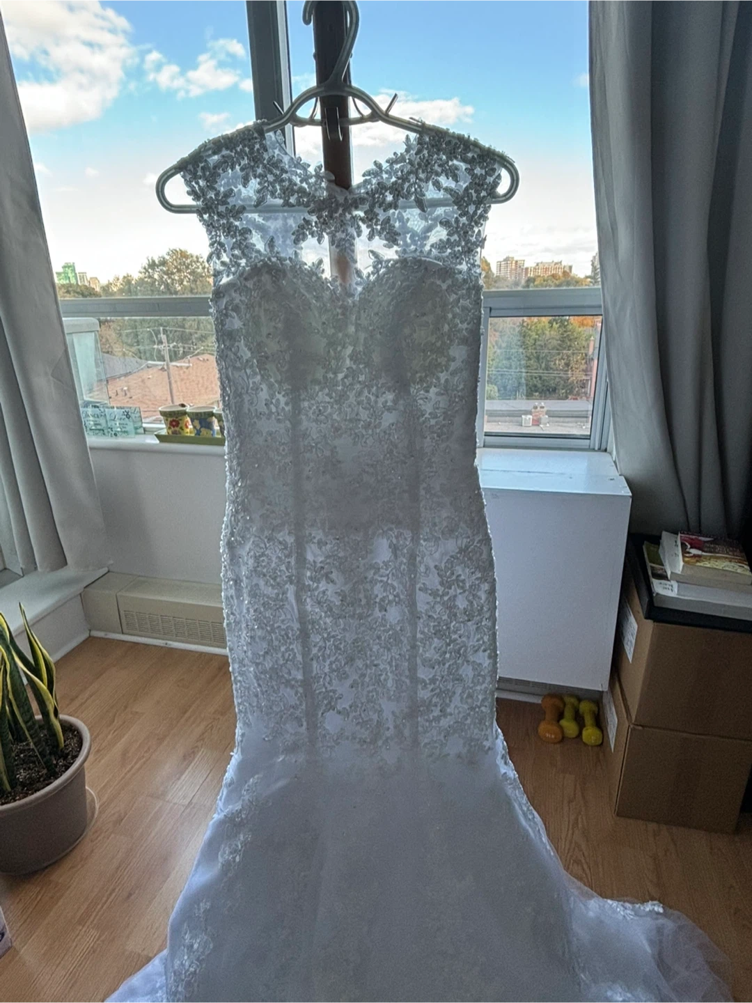 Beautiful white wedding dress with intricate lace detailing. Perfect for your special day!