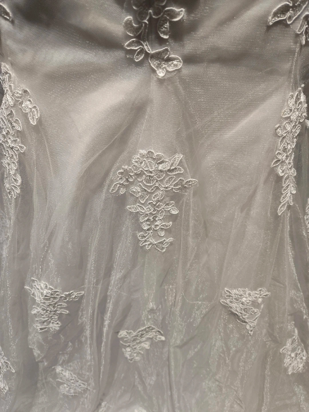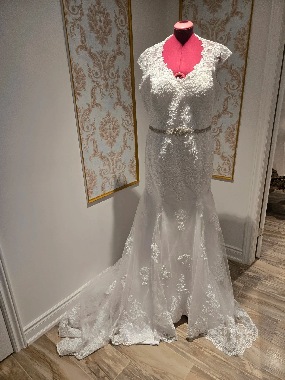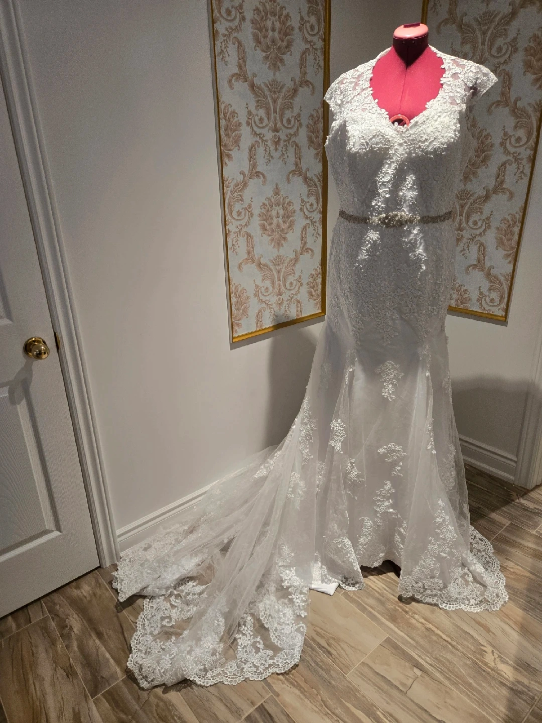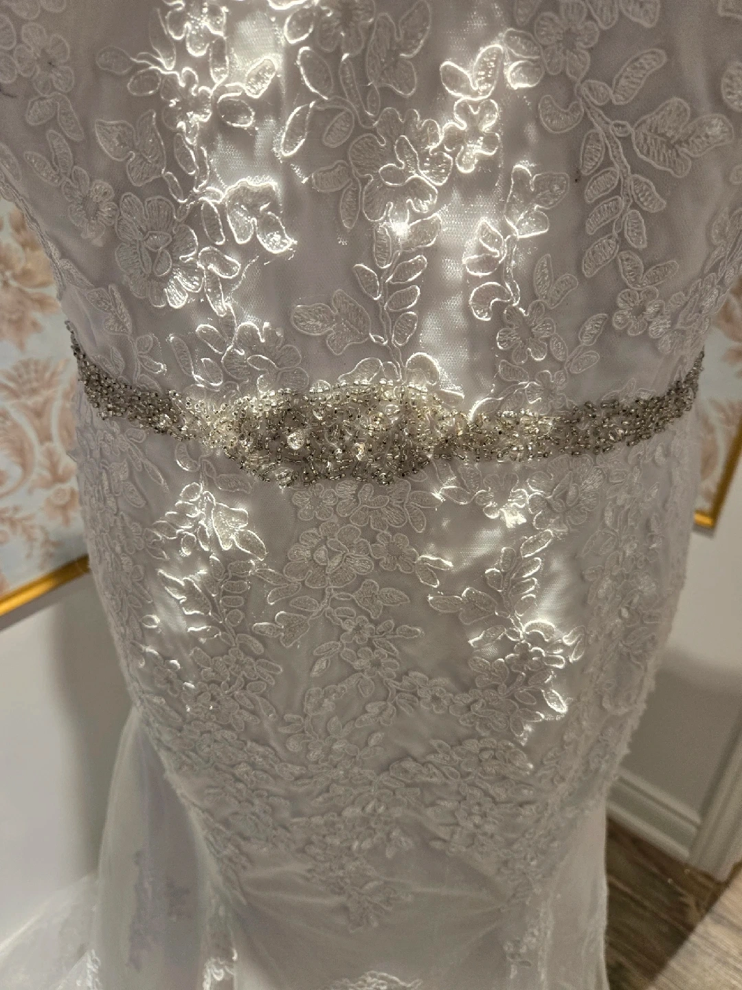 60Selling a beautiful white lace wedding dress. It features delicate lace detailing throughout, a fitted bodice, and a flowing train. The dress has a beaded belt at the waist and button detailing on the back. It's in great condition! This dress comes with long veil.
