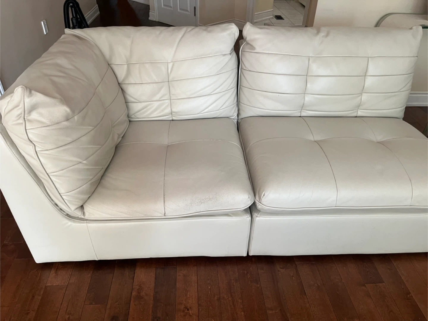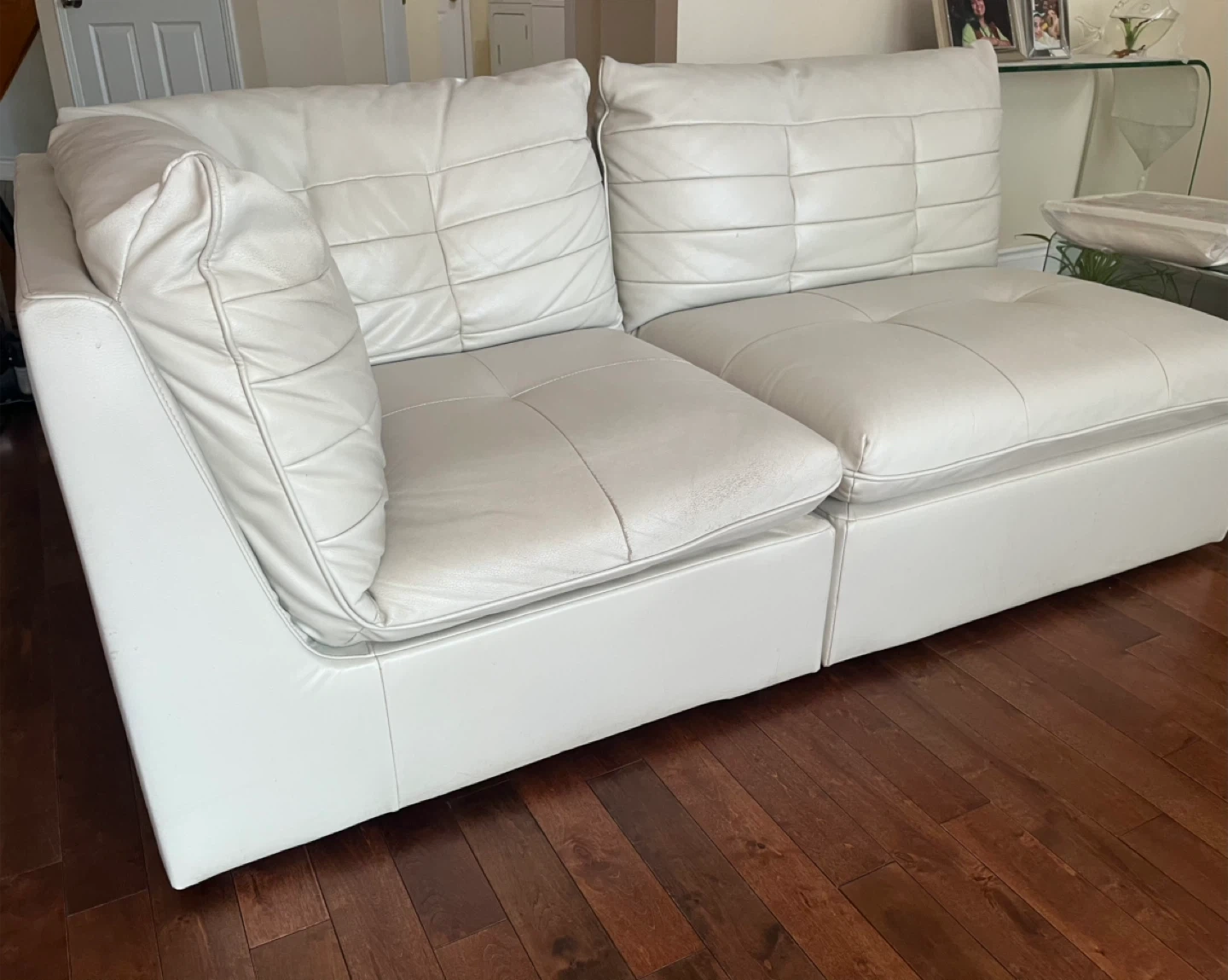 10Selling a comfy white leather two-seater sofa. It's in good condition and would be a great addition to any living room or den. The leather is soft and the cushions are very comfortable! Leather slightly off from the lower edge of the seat.