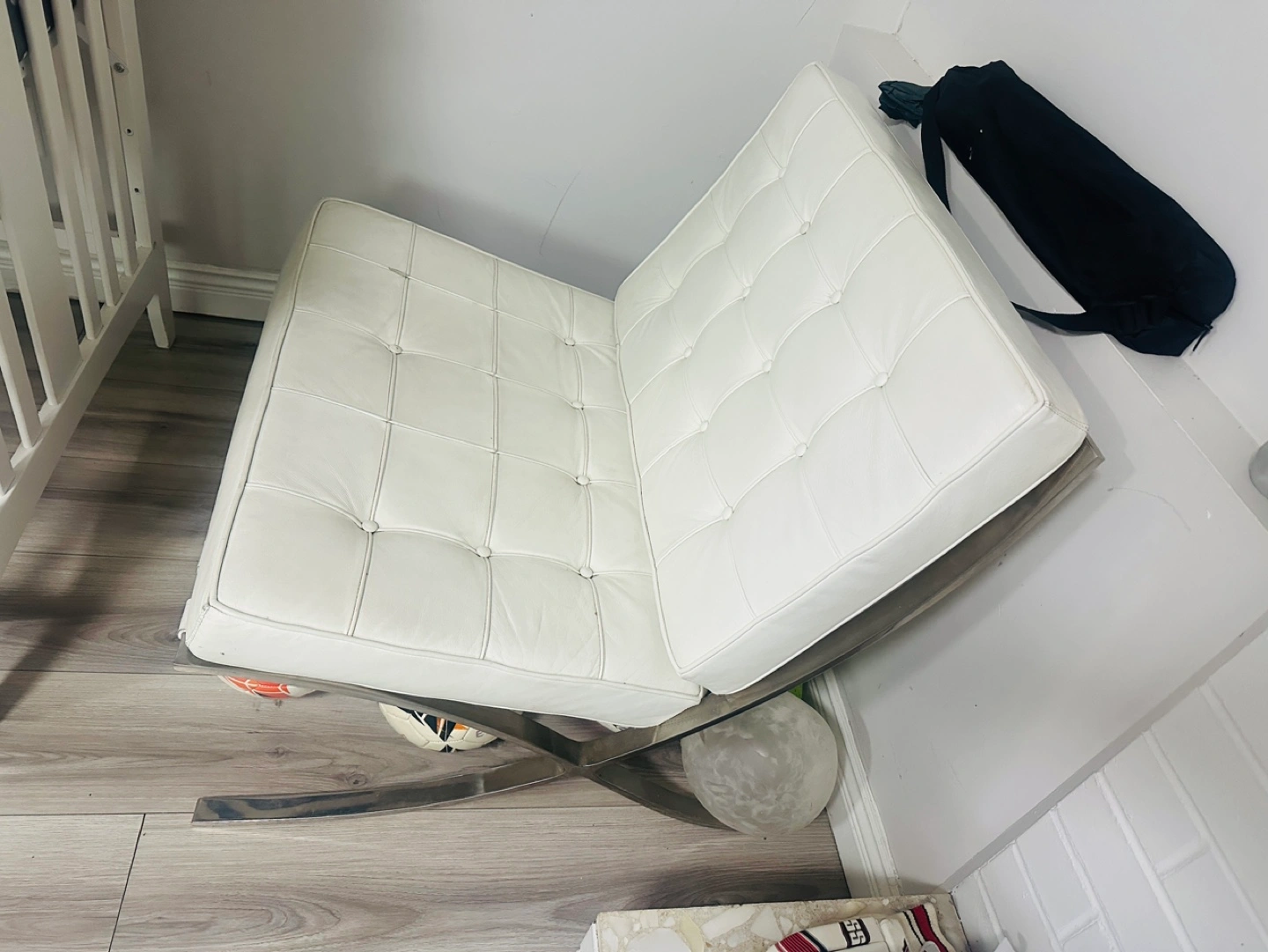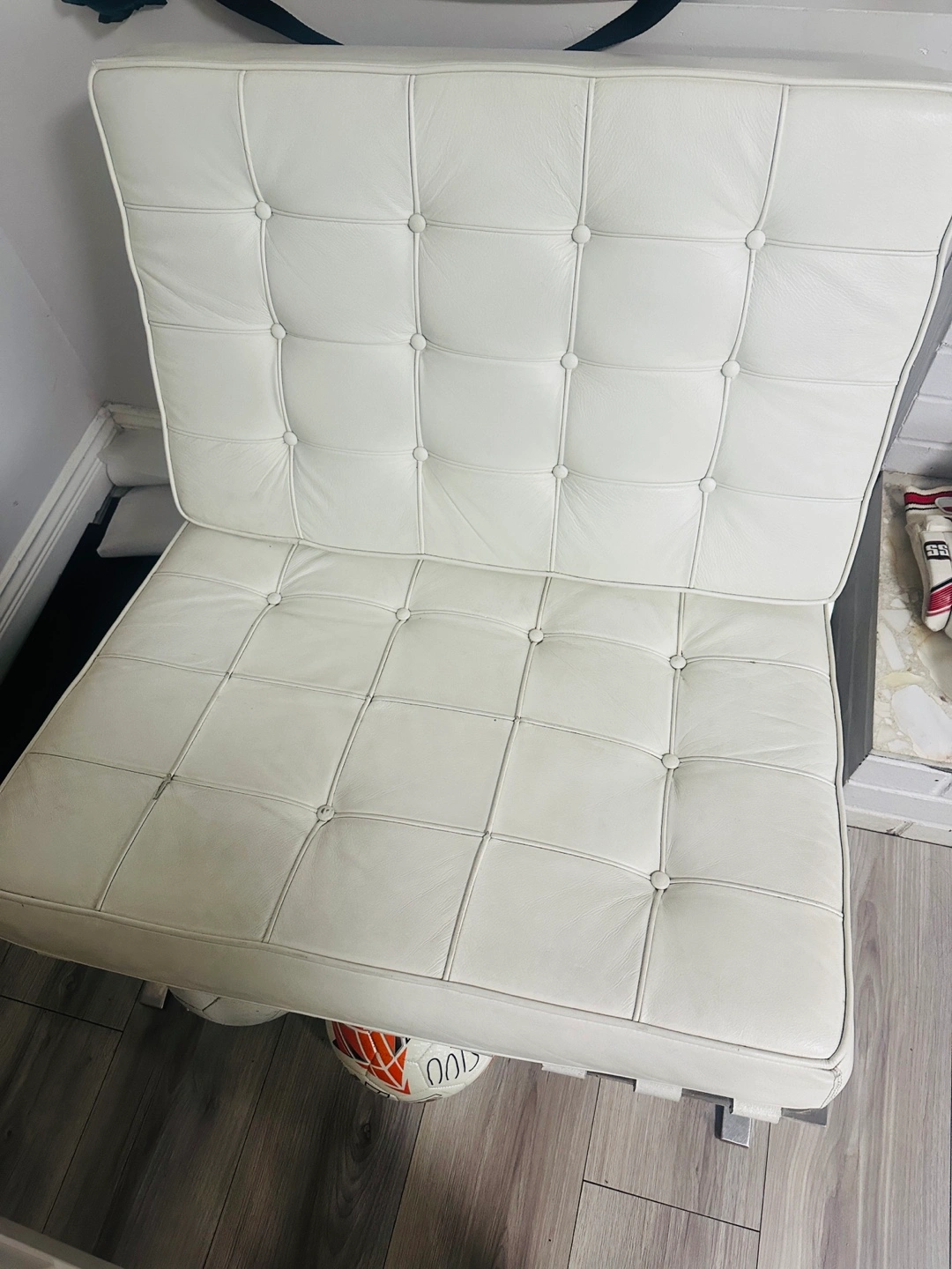 10Modern style chair. White leather upholstery. Sleek chrome legs. Comfortable seating. Minimalist design. Perfect for living room or bedroom.