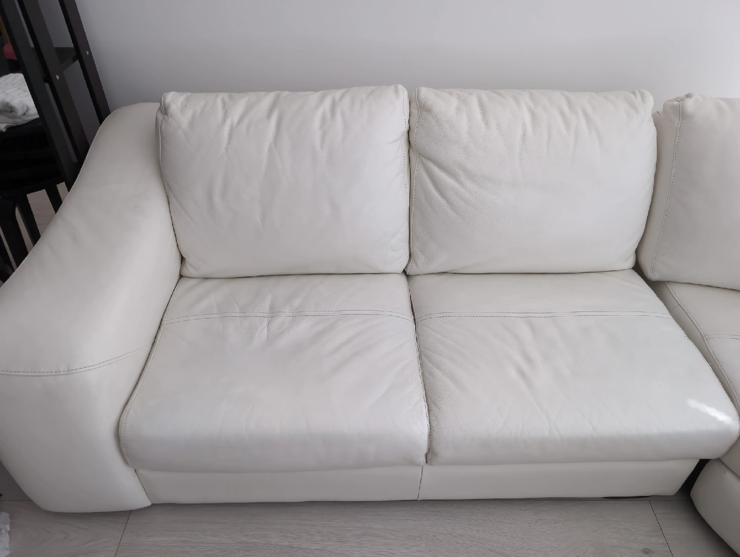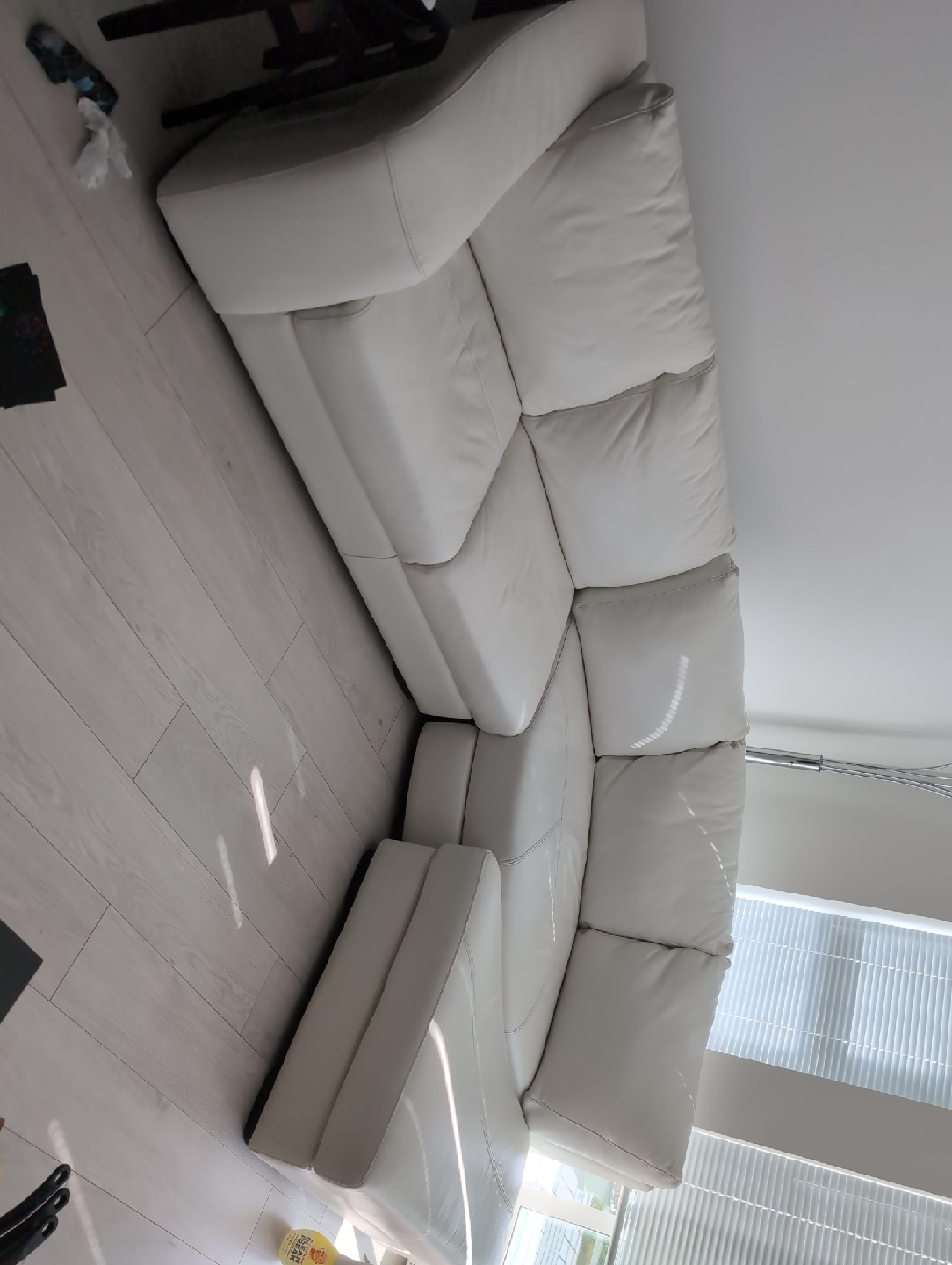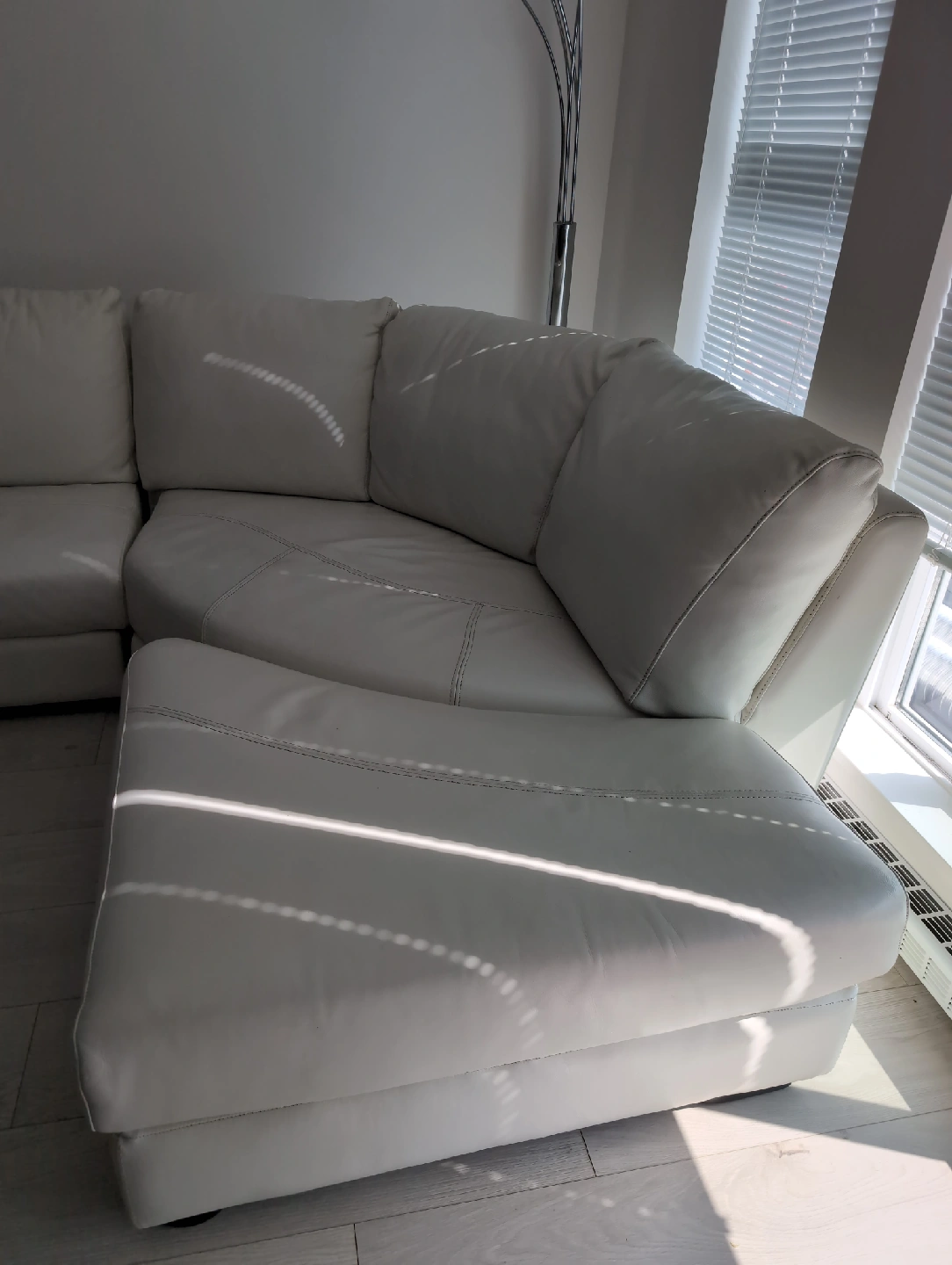 144Selling a comfy white leather sectional sofa, perfect for a living room or den! It comes with a matching ottoman to put your feet up after a long day. The sofa is in great condition and ready for a new home. It's a great piece for relaxing and entertaining!