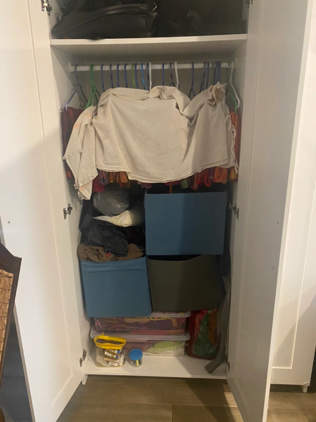 5Tall white wardrobe armoire. Three doors, one mirrored. Lots of storage space. Shelves and hanging rod inside. Very Good condition fully assembled Link to product for dimensions https://www.ikea.com/ca/en/p/brimnes-wardrobe-with-3-doors-white-90574800/