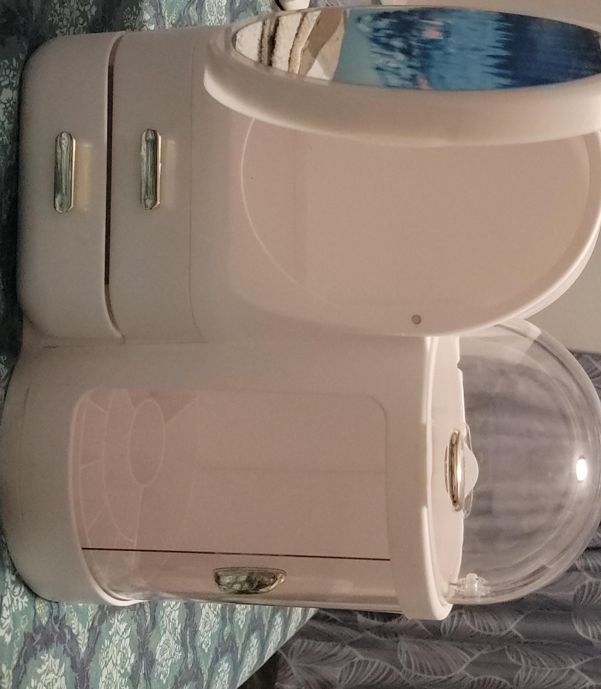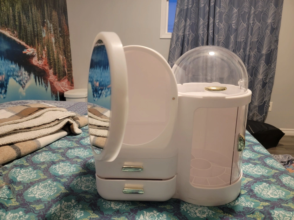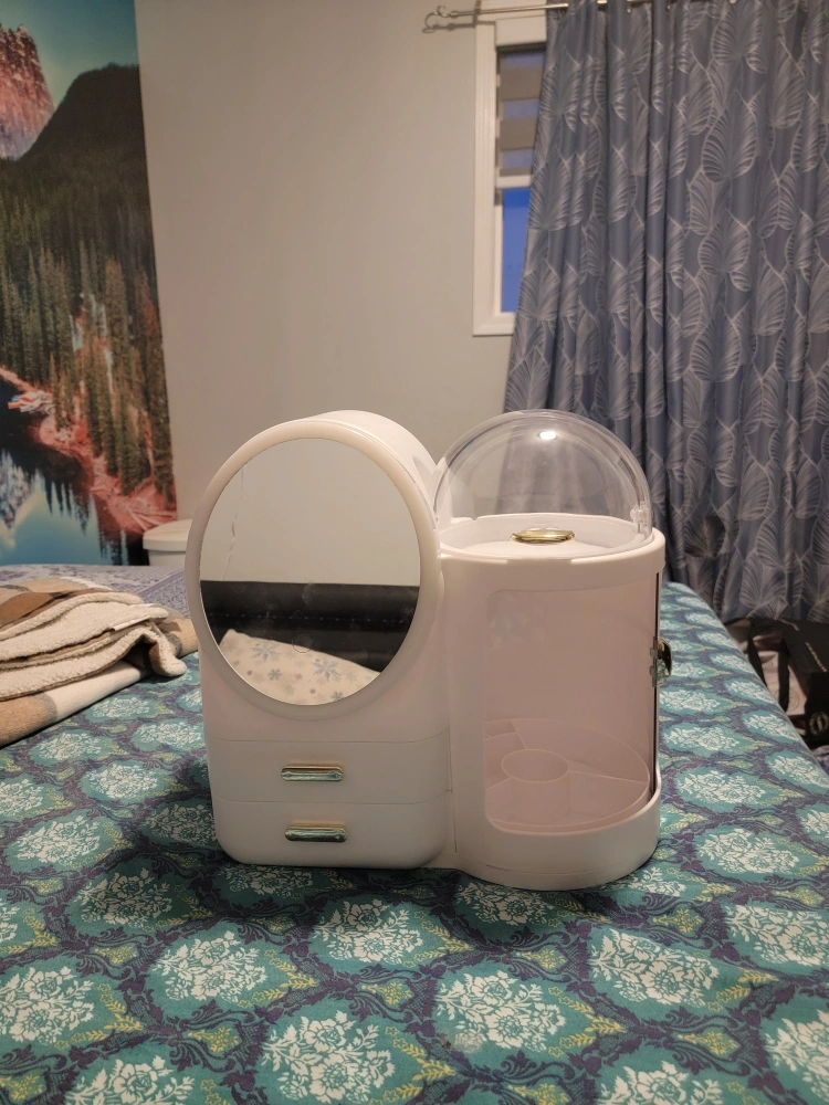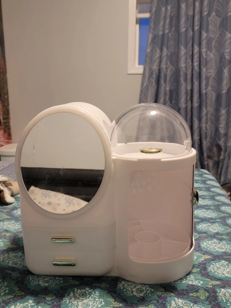 10Selling a cute white makeup organizer! It comes with a mirror and a clear dome top. It has a few drawers and compartments to keep your makeup and accessories tidy and organized. Perfect for your vanity or bathroom counter. The mirror also has 3 modes!!