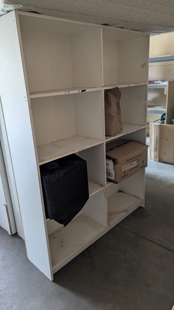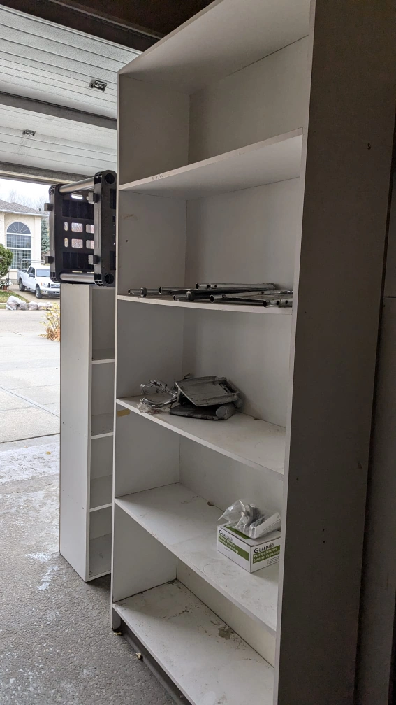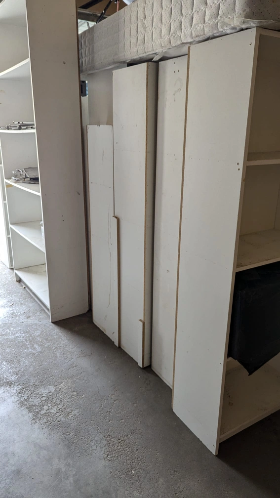 Multiple white melamine shelving units. Great for garage storage or organization. Sold as is. 12 shelves for 300$ or 40$ each Measurements ( the rest mentioned above) 1-----36*21*12.5 2---63*48*12.5 3---- 64.5*48*12.5 inches 4----54.5*47.5*12.5