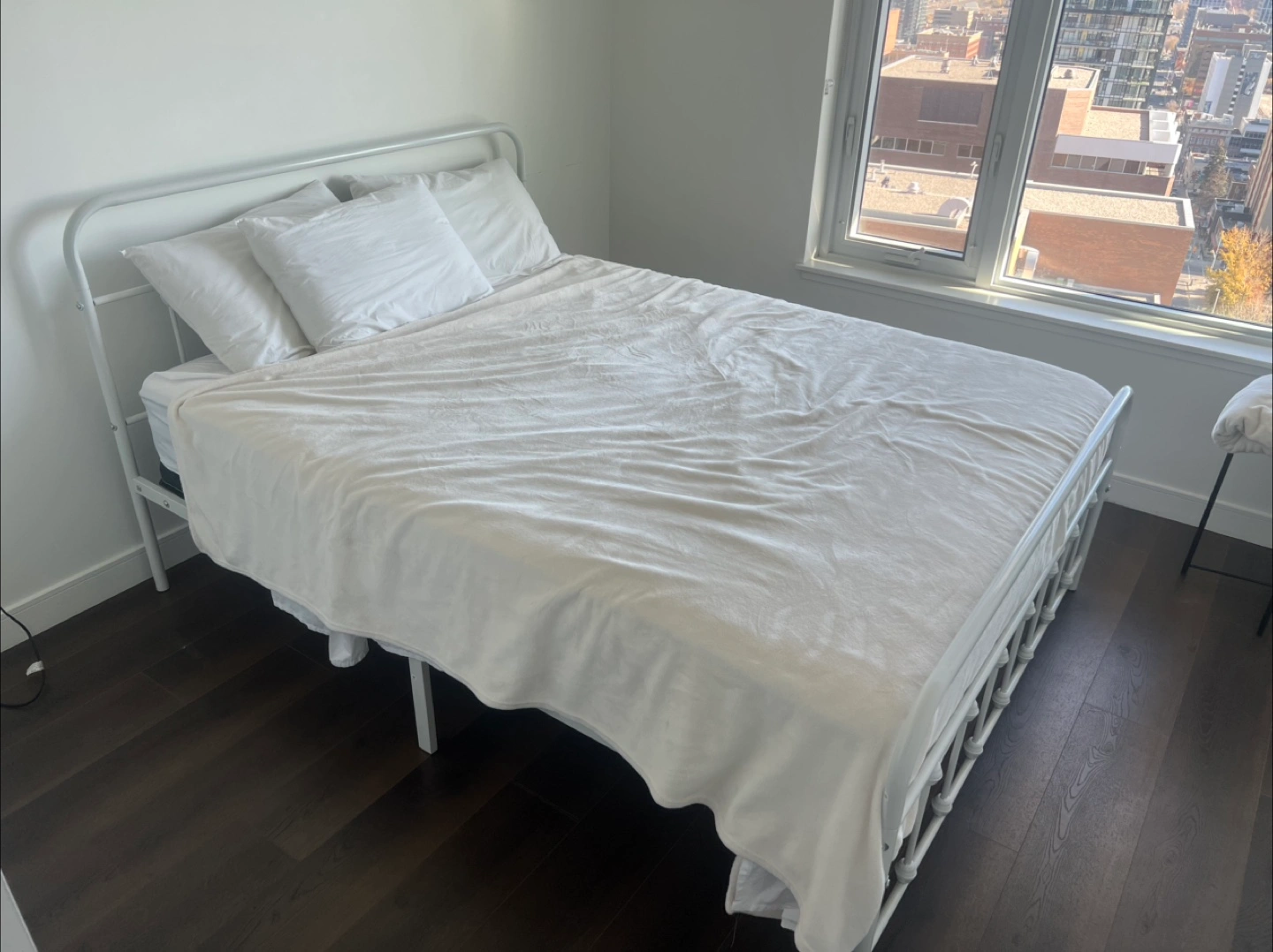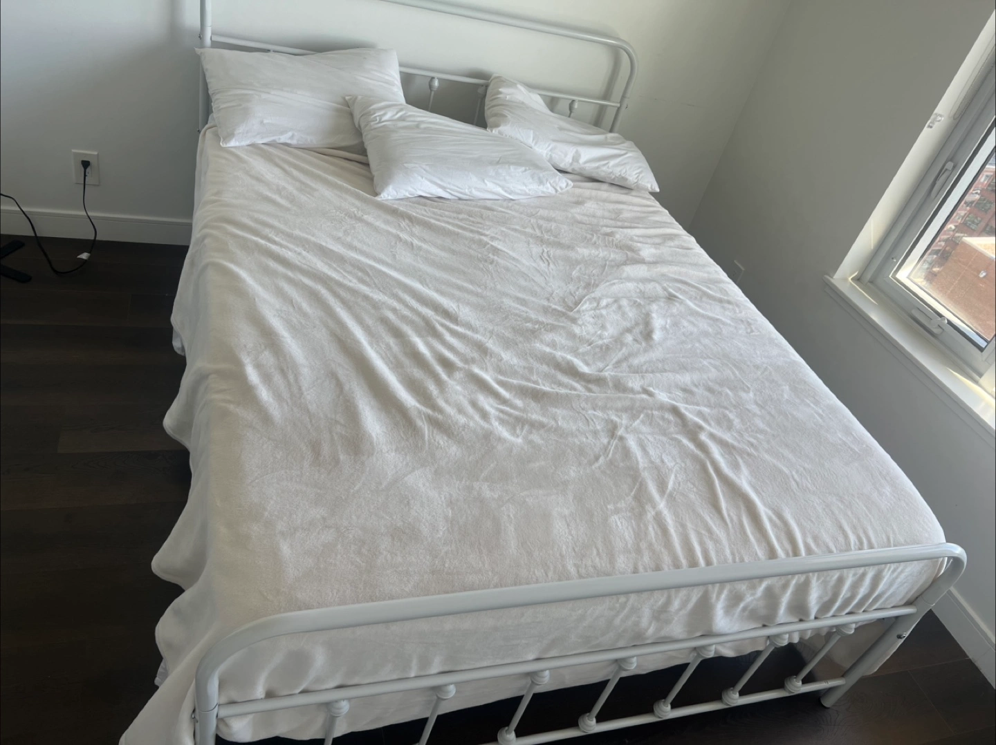 18Selling a white metal bed frame, perfect for a full or double size mattress. It's in great shape and ready for a new home. Simple and stylish design that fits any bedroom decor! Includes mattress