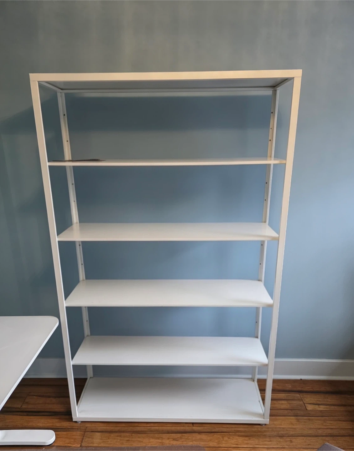 10Selling a simple white bookshelf with a metal frame. It has five shelves and is in great condition. Perfect for adding some extra storage to your space!