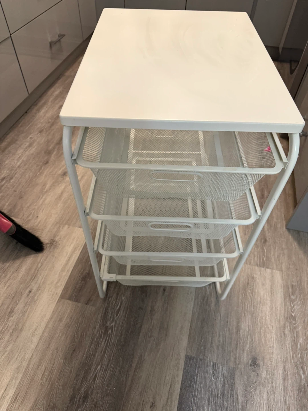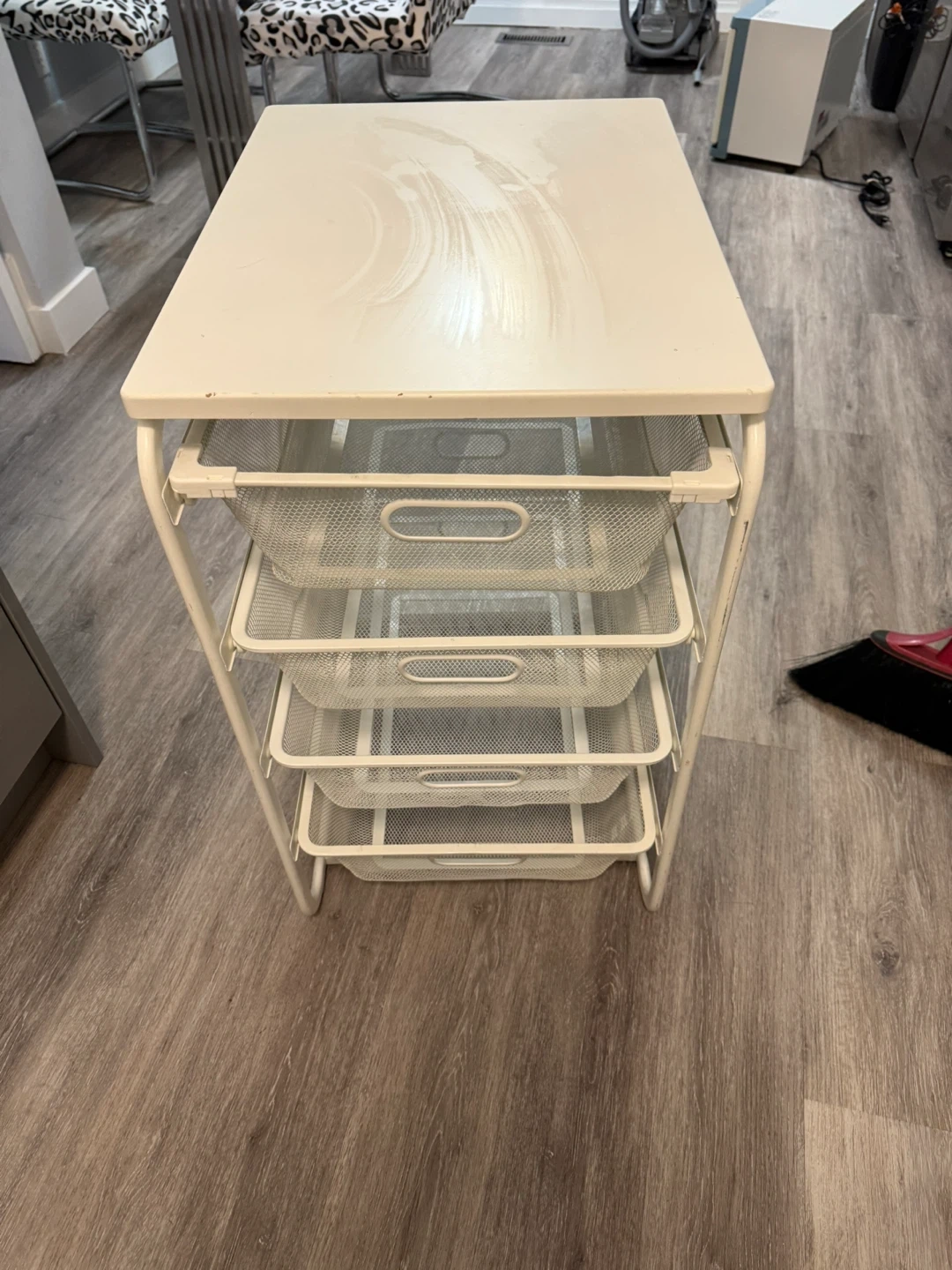 Selling a handy rolling cart with a smooth white top and four wire mesh drawers! It's great for adding extra storage to any room. The cart is in good condition and ready for a new home