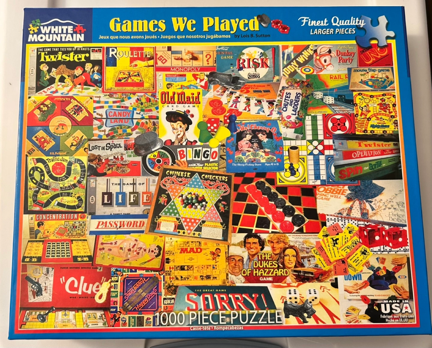 1000-piece jigsaw puzzle. Features images of classic board games. Larger pieces. Fine quality. 😊