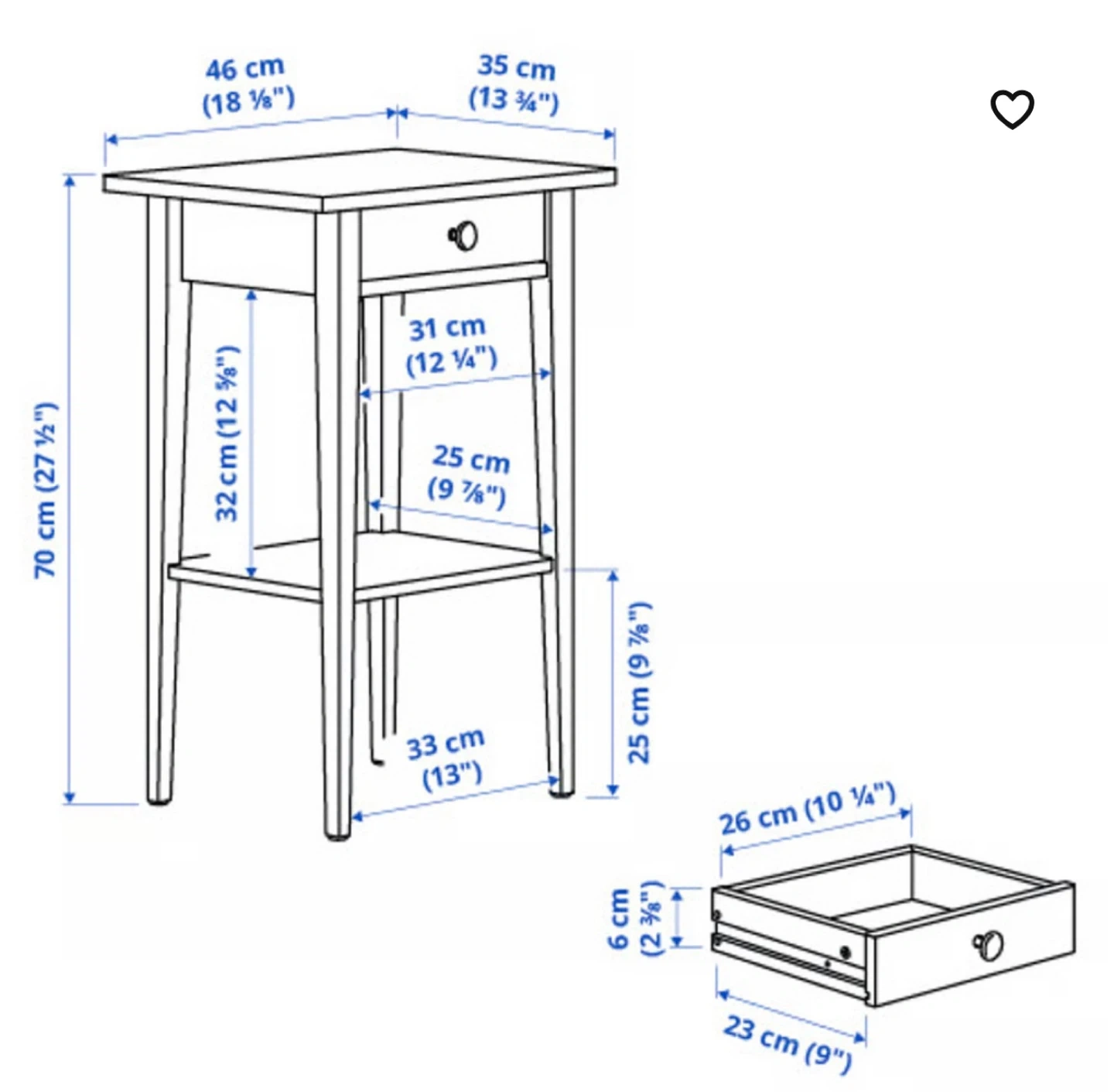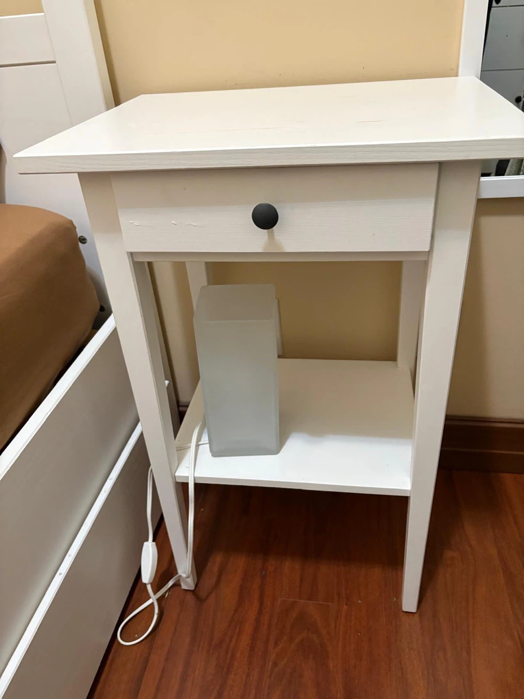 Selling a white nightstand. It's in great shape and perfect for beside your bed! It features a drawer and a shelf for extra storage. Dimensions: - Height: 70 cm (27 ½") - Width: 46 cm (18 ⅛") - Depth: 35 cm (13 ¾")