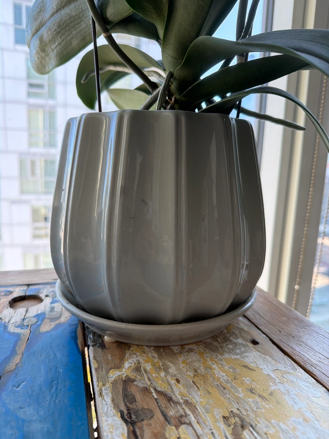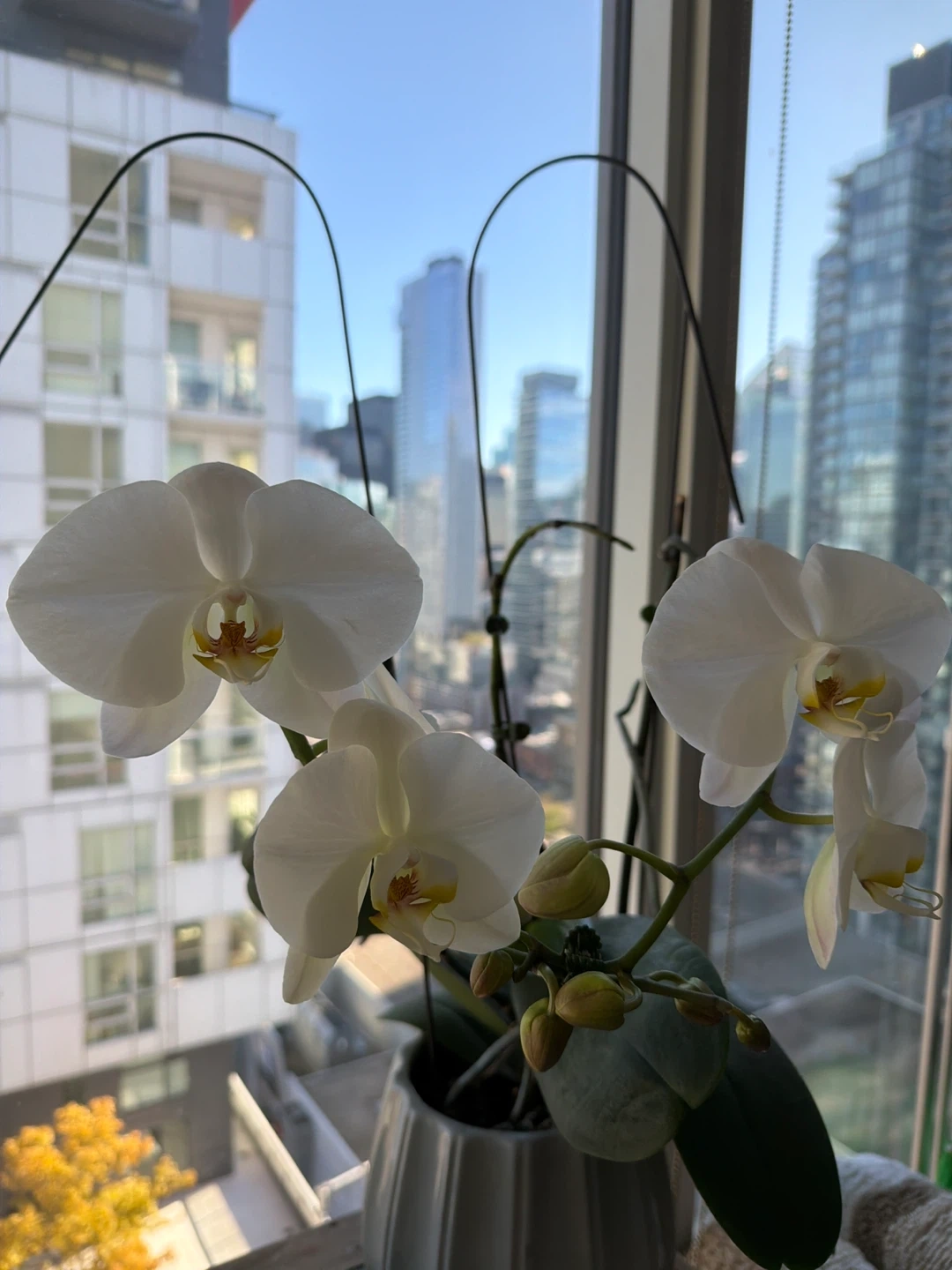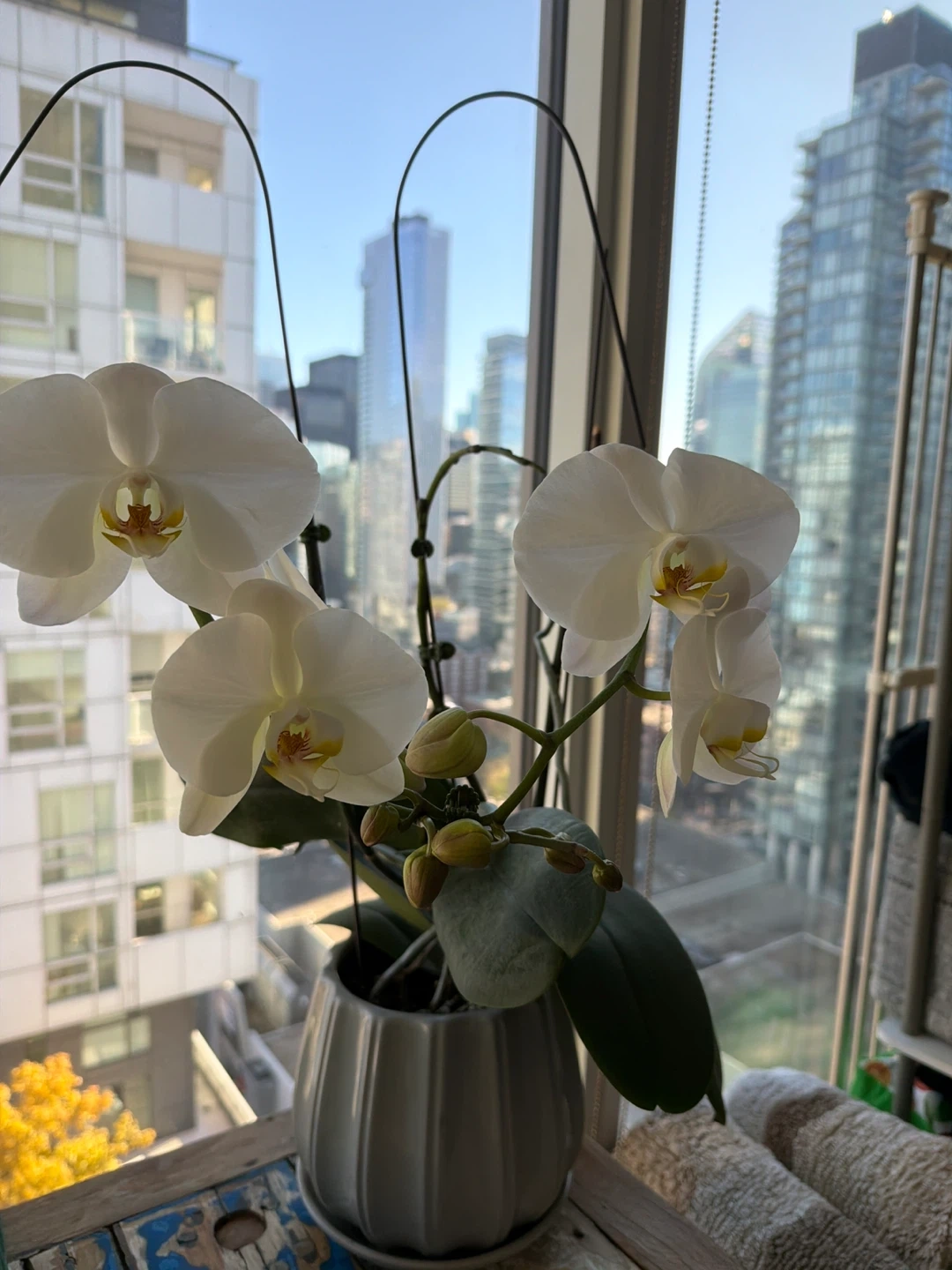 384Selling a beautiful white orchid plant in a grey pot. It's a lovely addition to any room and brings a touch of nature indoors