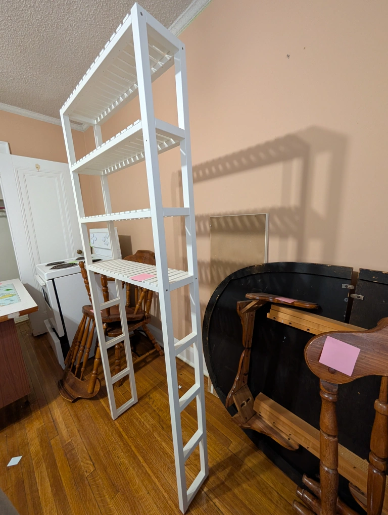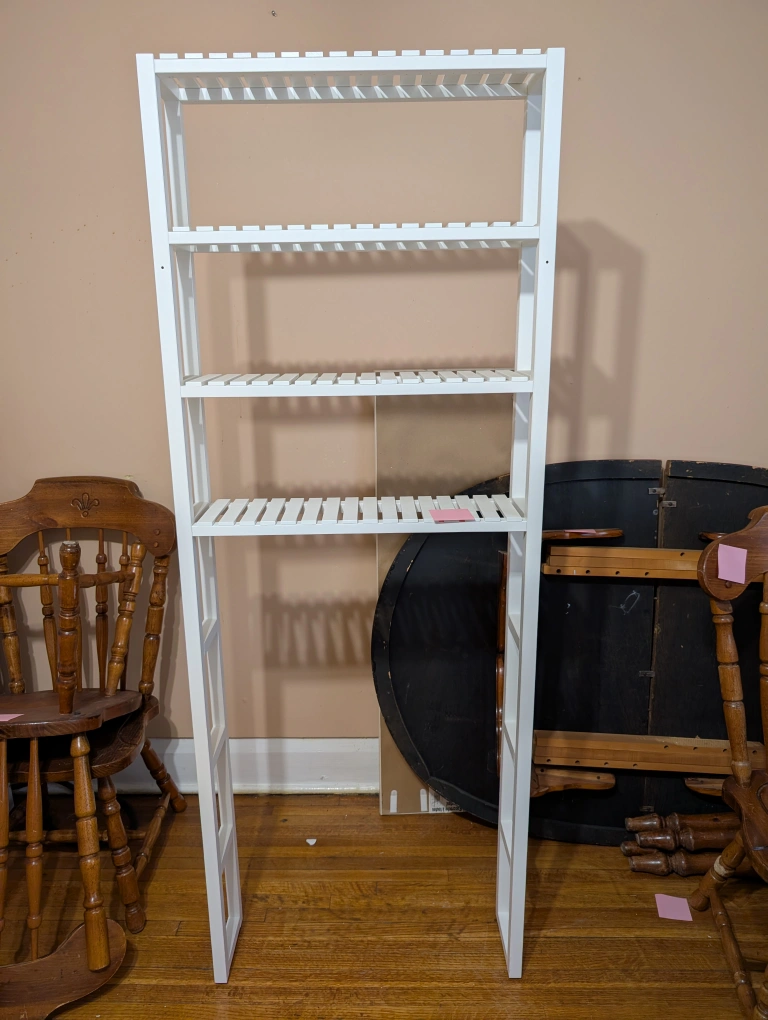 52Tall, narrow shelving unit. Four shelves. White finish. Good for bathroom storage. Approximately 6 feet tall, 26 & 5/8 inches wide, and 7 1/8 inches deep.