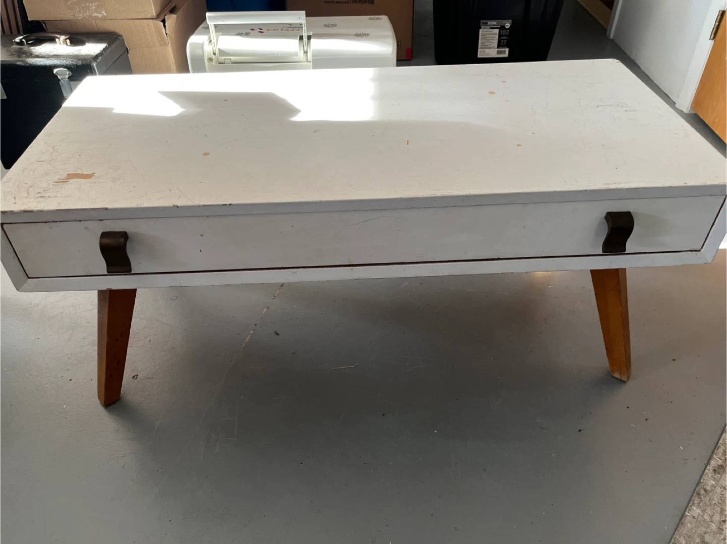 Selling a cute little coffee table! It's painted white and has a drawer for storage. There are some signs of wear and tear, but it's still a functional and stylish piece for your living room or den