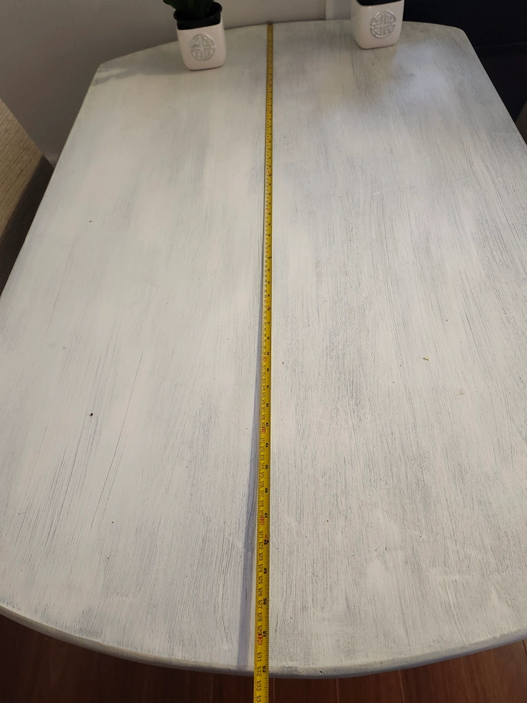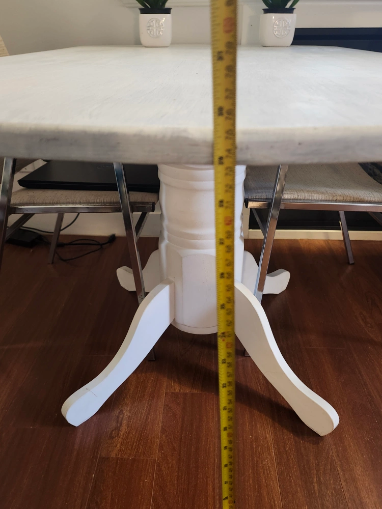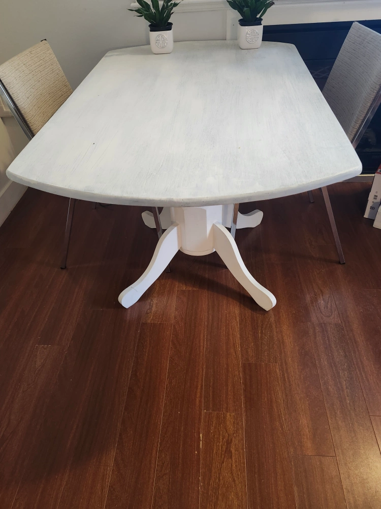 Selling a charming white painted wooden dining table. It measures approximately 32 inches wide and 52 inches long. The table has a pedestal base and a lovely, slightly distressed finish. Perfect for a cozy dining space!