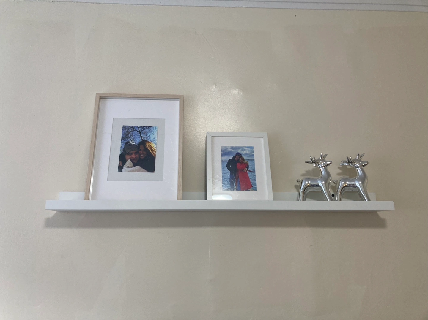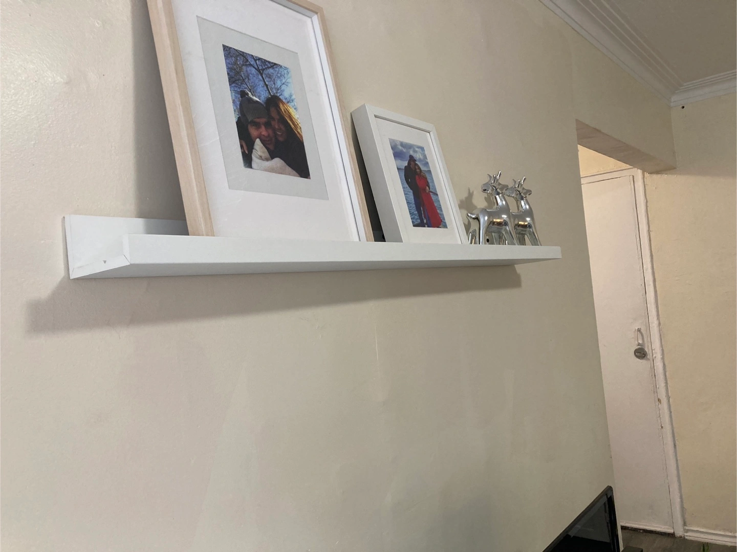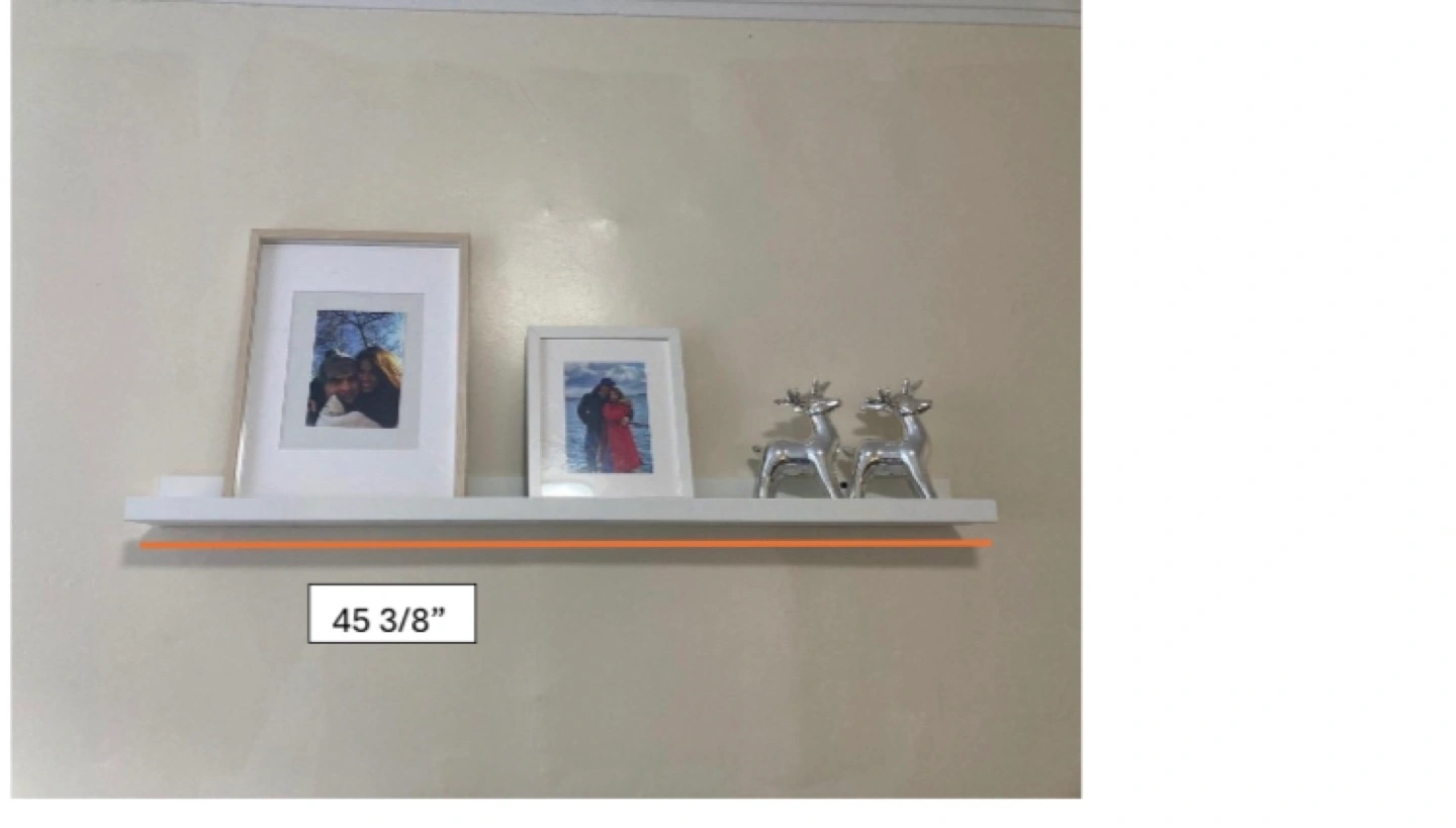 Selling a picture ledge shelf in white. It's 45 3/8 inches long, perfect for displaying photos or small decorative items in your home