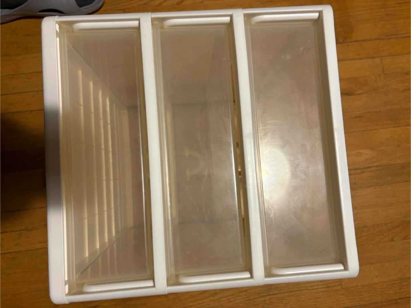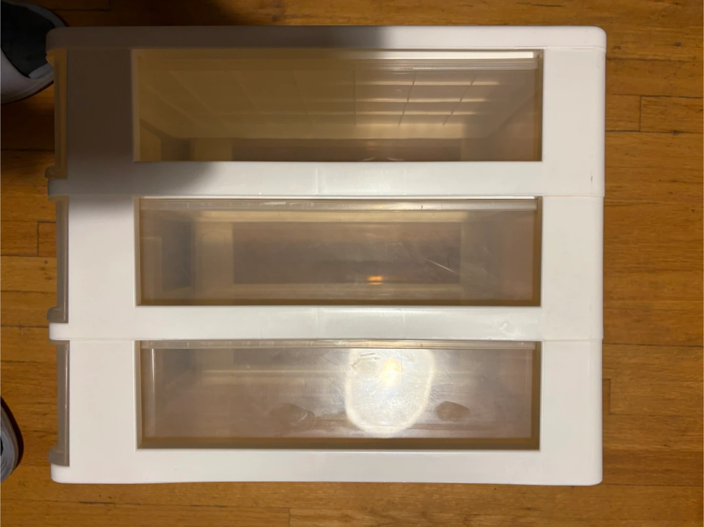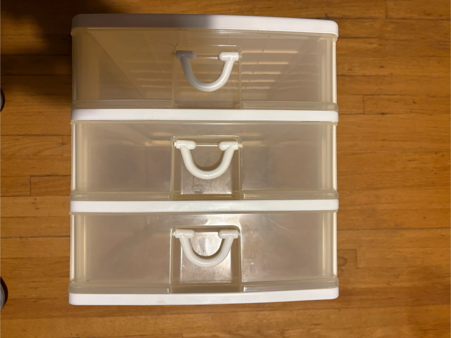 Selling a handy white plastic storage unit with three drawers! It's great for organizing small items around the house. There is a crack on one of the drawers as shown in the pictures. Pick up at Morley trail NW