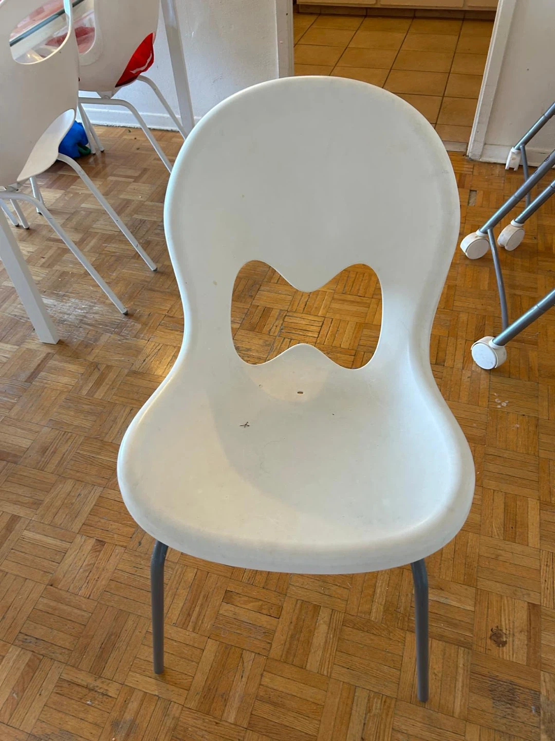 Selling a white plastic chair. It's in good condition and ready for a new home. Perfect for adding extra seating to your dining area or any room in your house! Reg Retail Price For Each is $75 I have 6 chairs good condition $25 $150