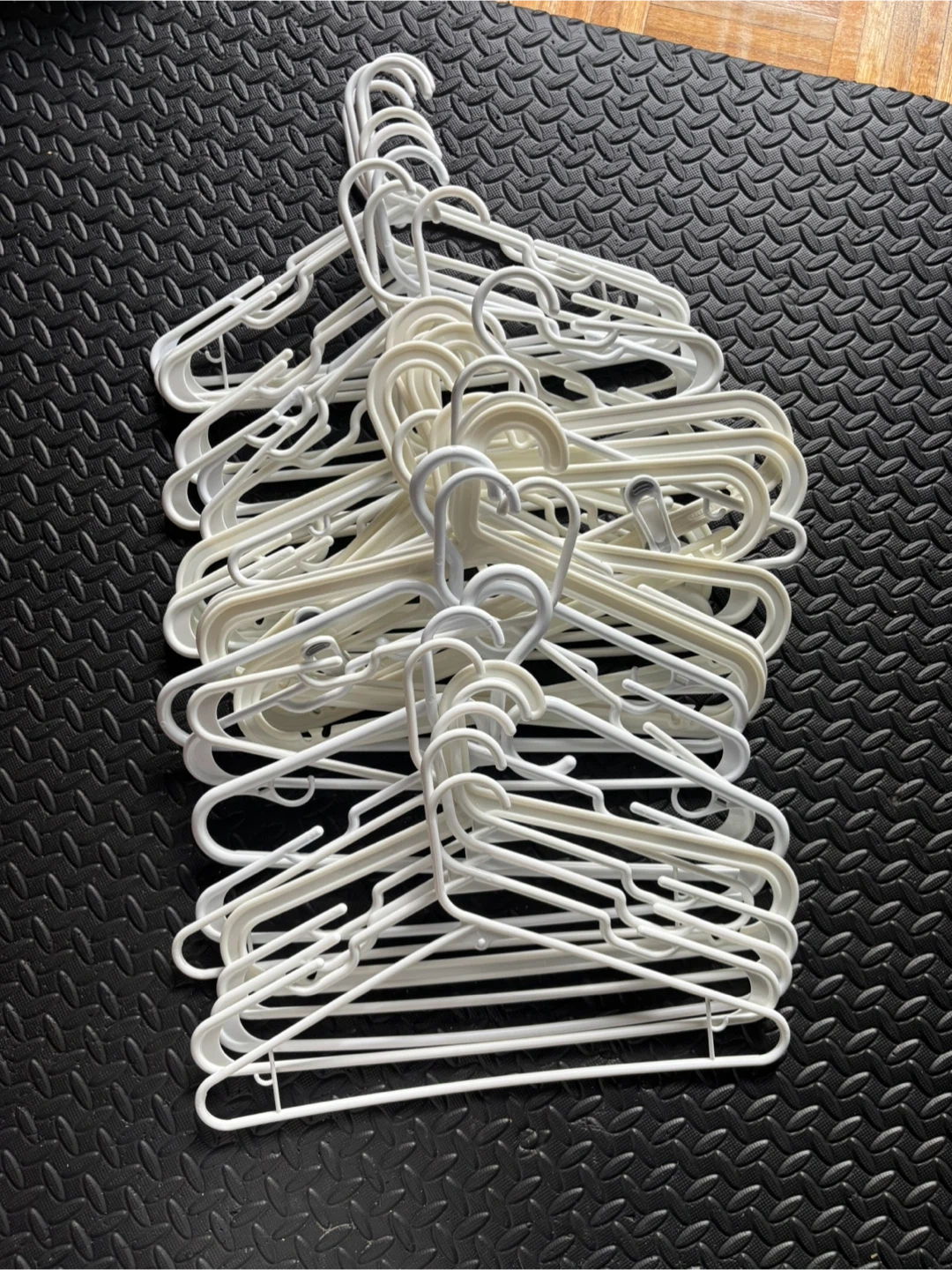 35Selling white plastic clothes hangers. They're in great shape and ready to help organize your closet!