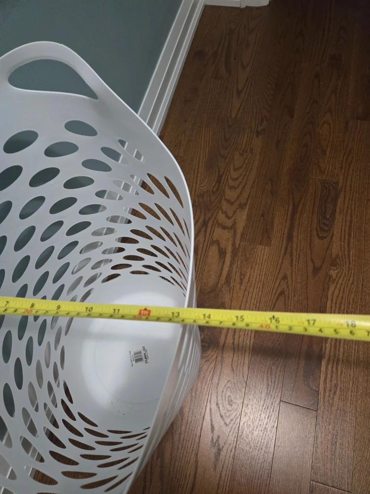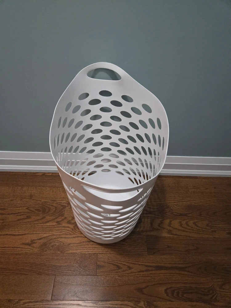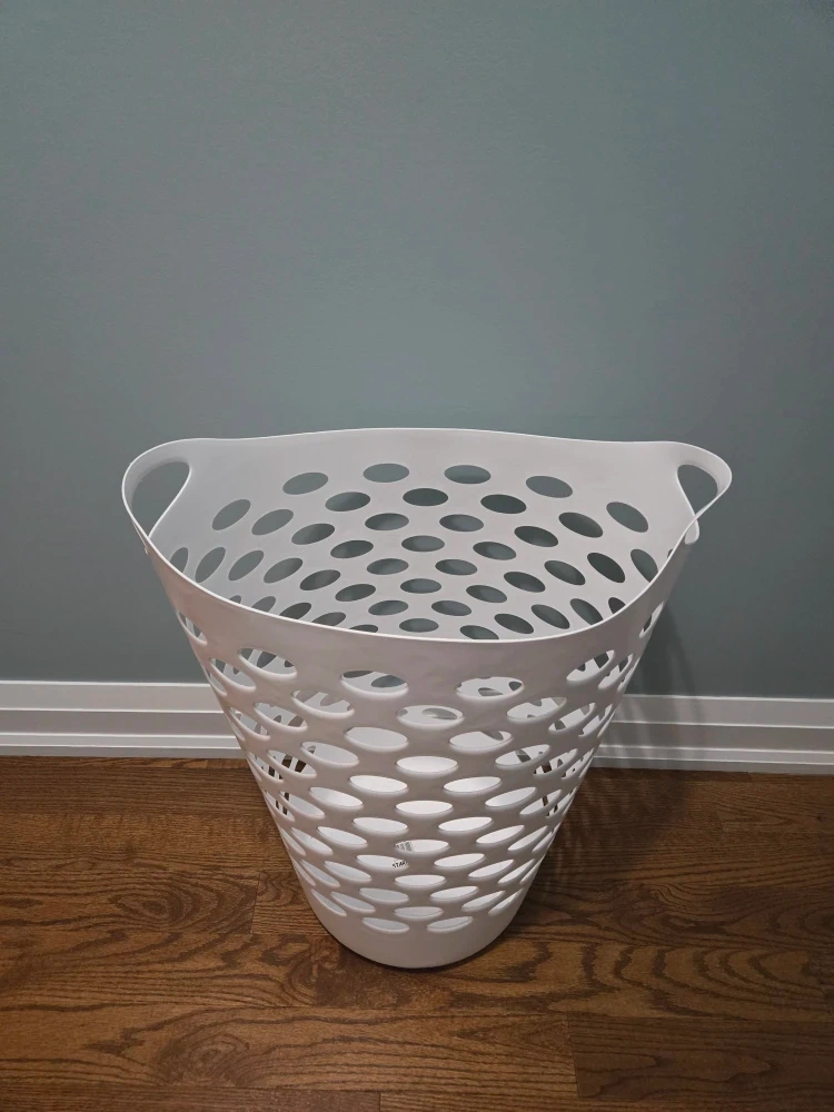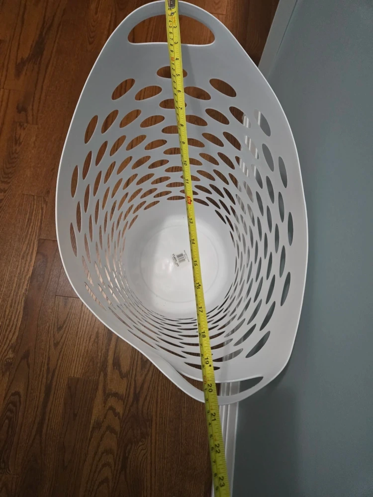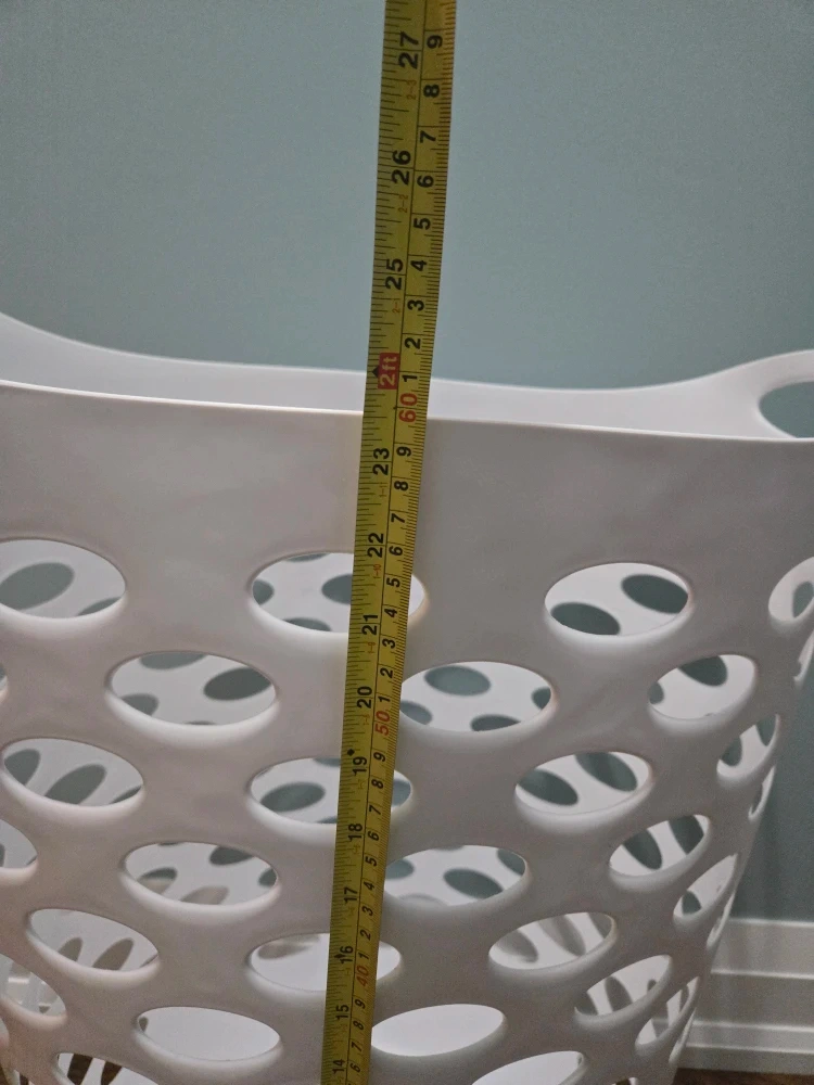68Here's a white plastic laundry basket! It's in great shape and ready to help with your laundry needs. It measures approximately 23.5 inches in height and 20 inches in diameter.