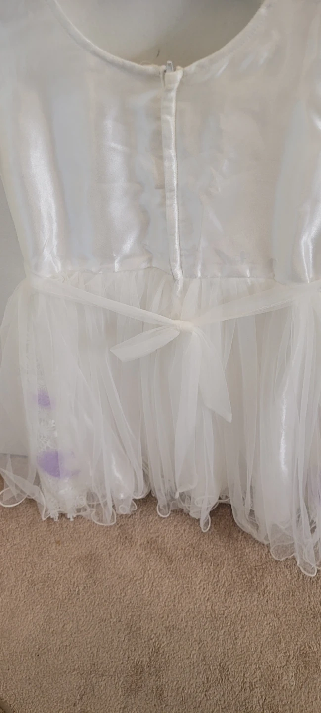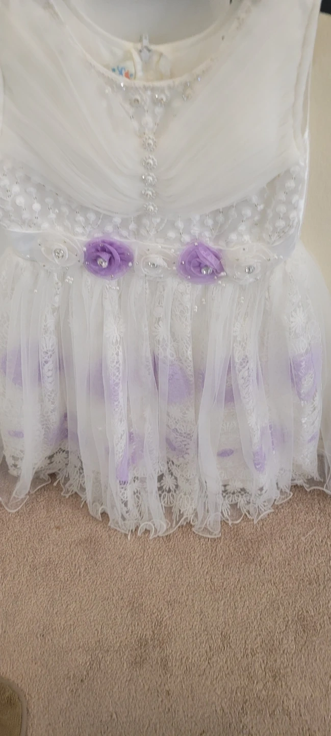 168A lovely white dress with purple accents! Perfect for a special occasion or just feeling fancy. The dress features delicate detailing and a comfortable fit. The lenght is 33 inches and waist size is 13 inches