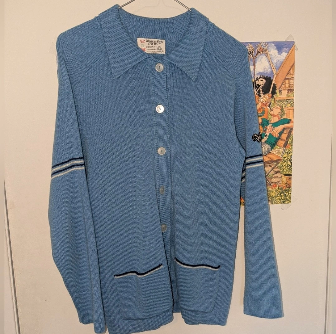 15Cozy blue cardigan from United Arrows! This sweater features a collared neckline, button-up closure, and striped detailing on the sleeves and pockets. Perfect for layering on chilly days