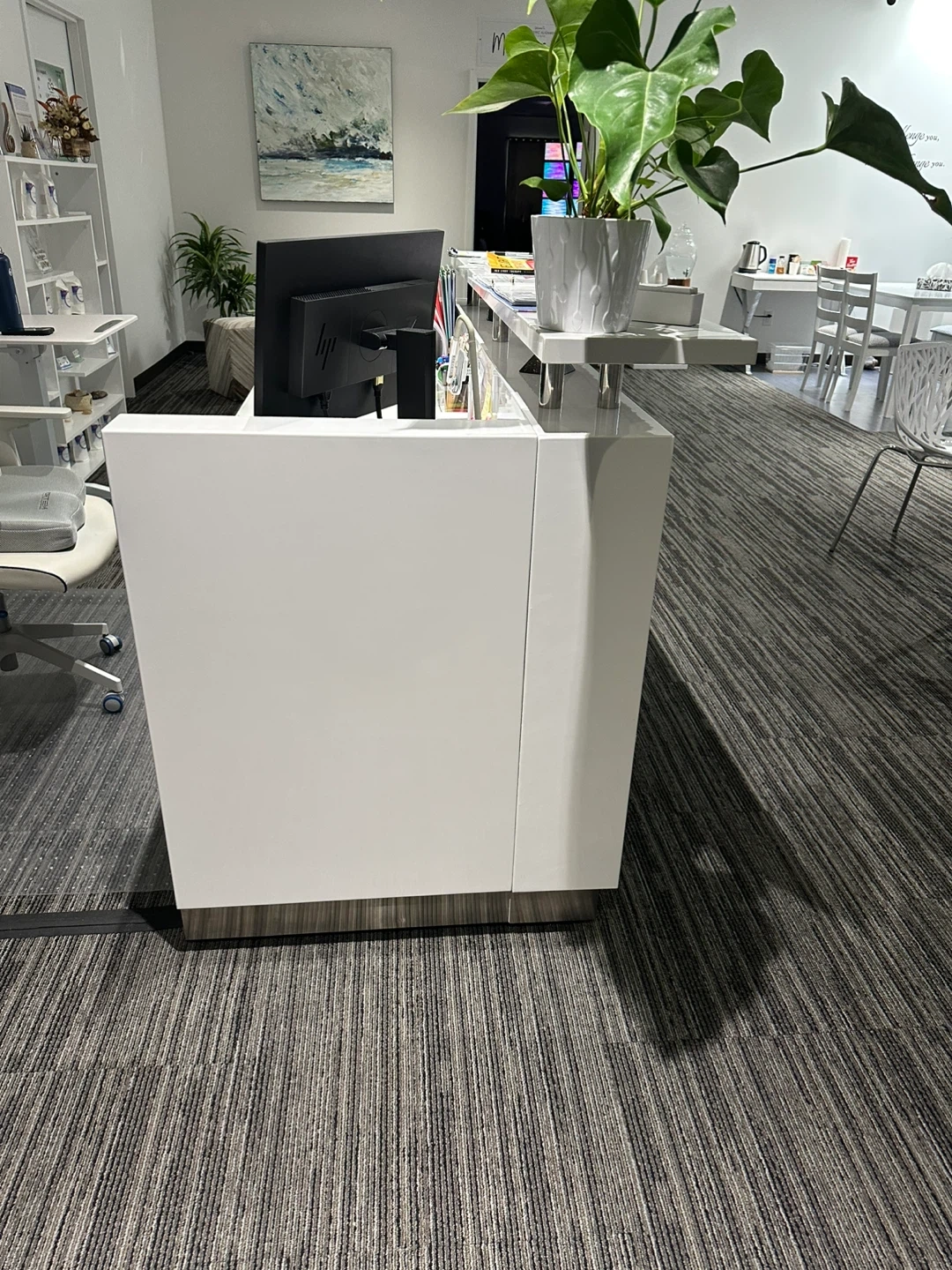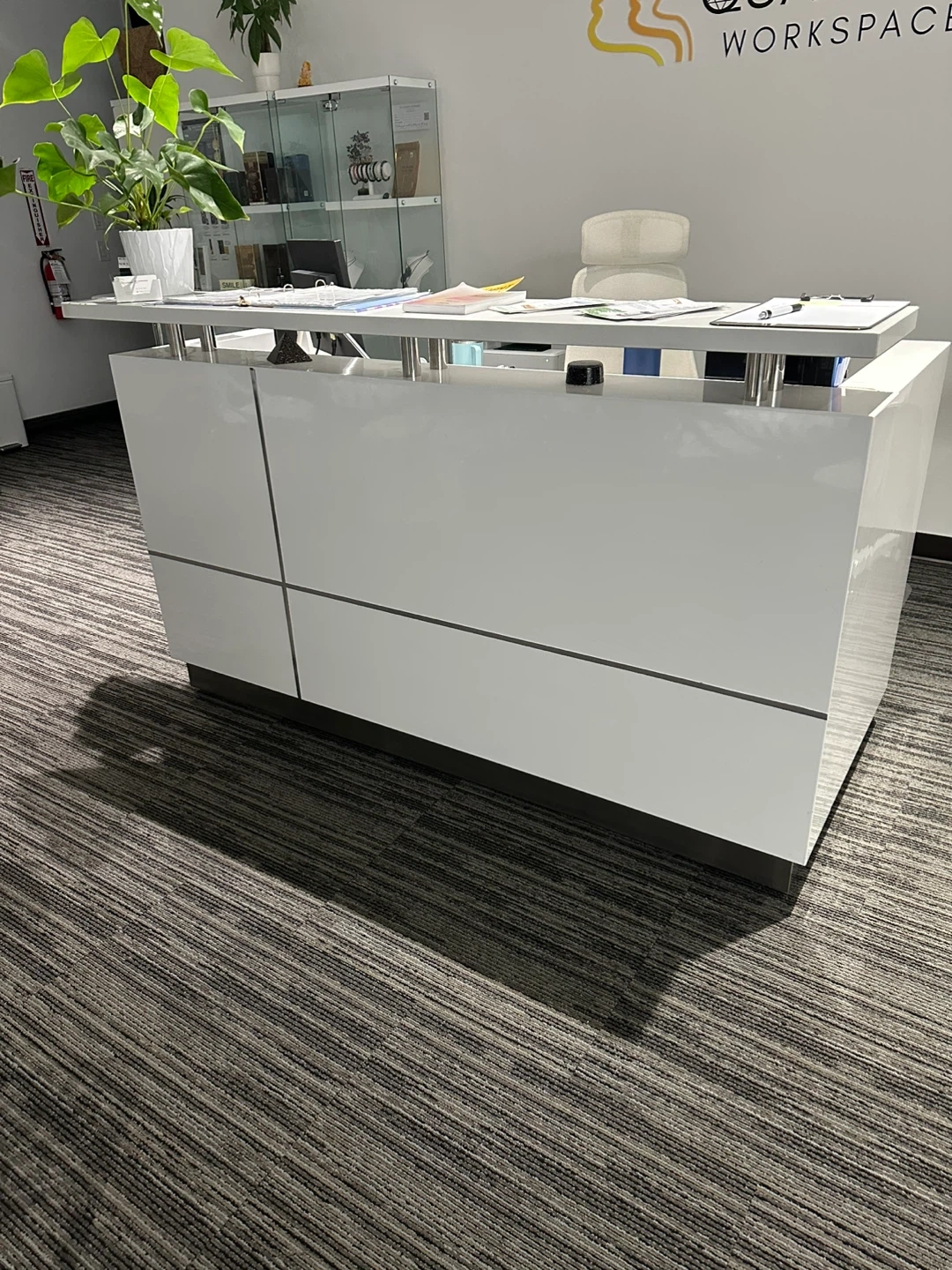 Selling a sleek, white reception desk! High gloss! It measures approximately 72 inches in length and 45 inches in height. Perfect for an office or business space looking for a modern touch
