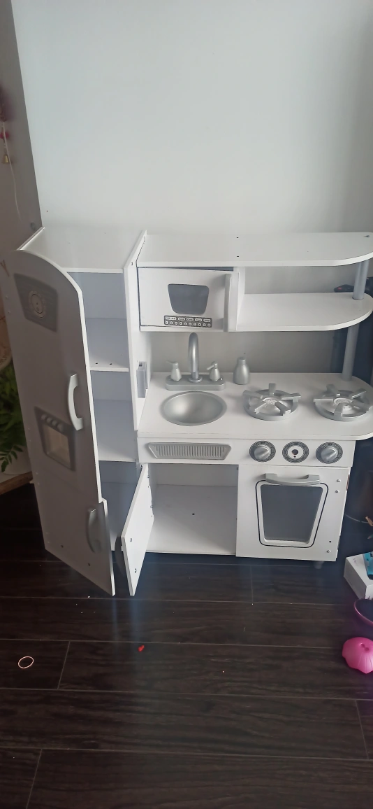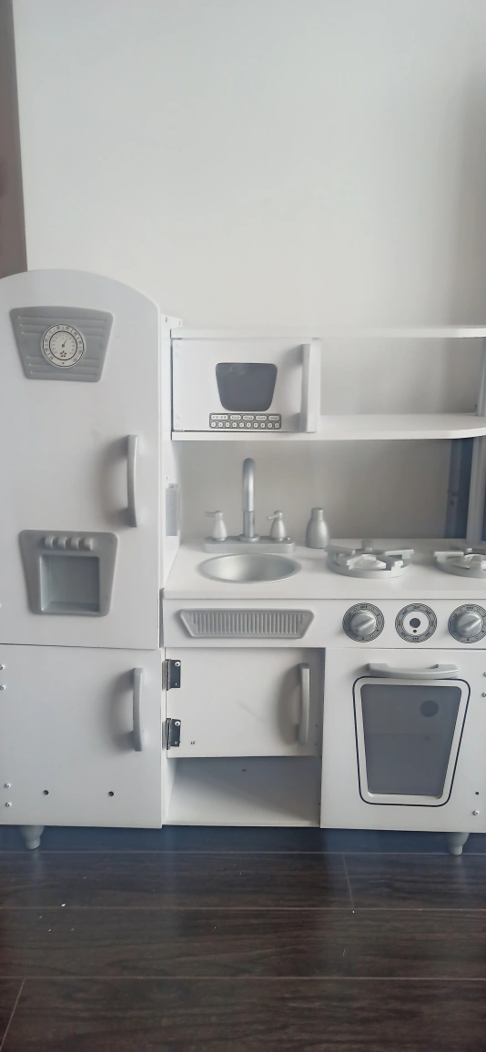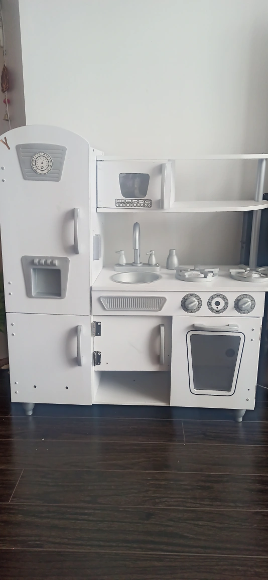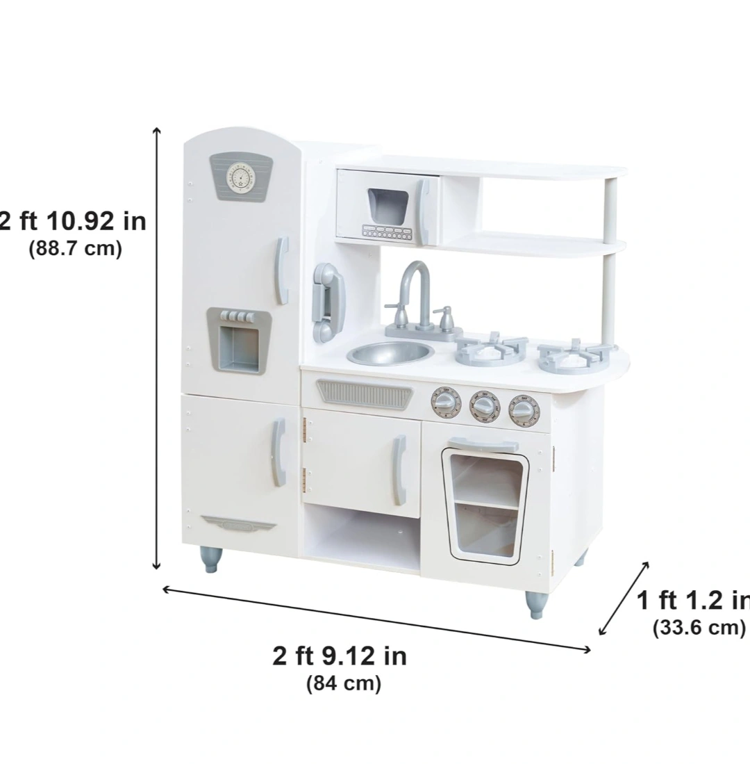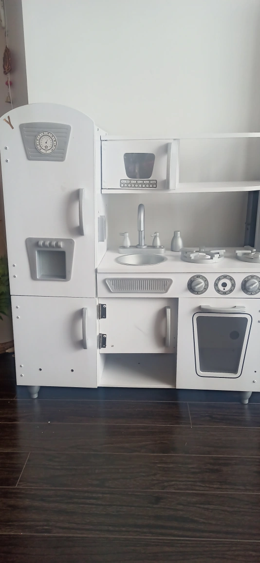 Adorable white play kitchen, features a fridge, stove, oven, sink, and microwave. Lots of storage. Great for imaginative play.KidKraft Vintage Wooden Play Kitchen with Pretend Ice Maker. one gas nob &Play Phone missing, pls check pictures for missing parts.