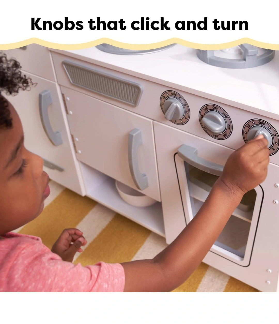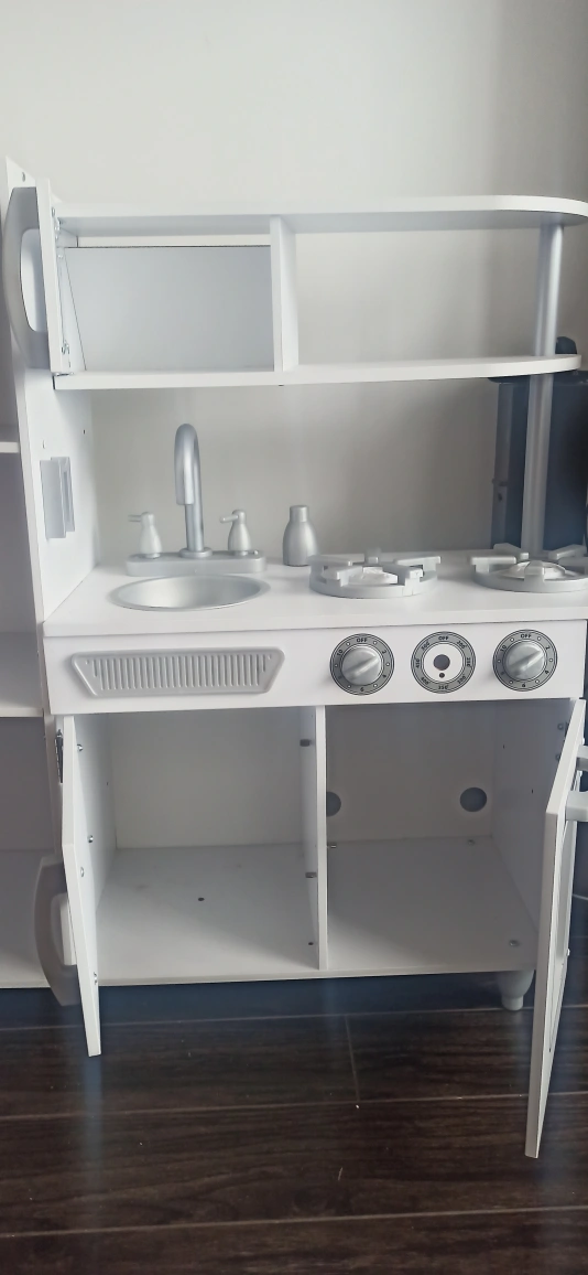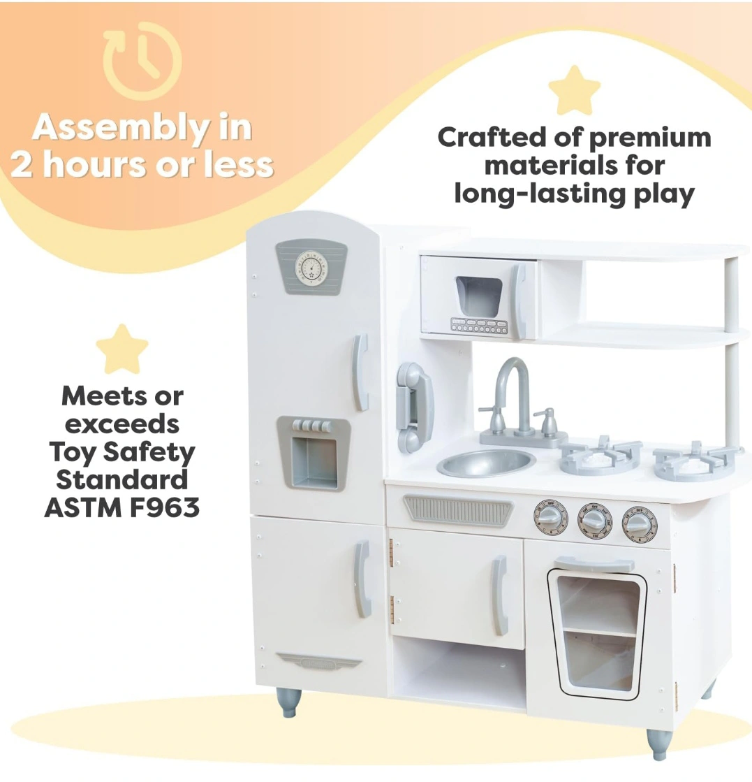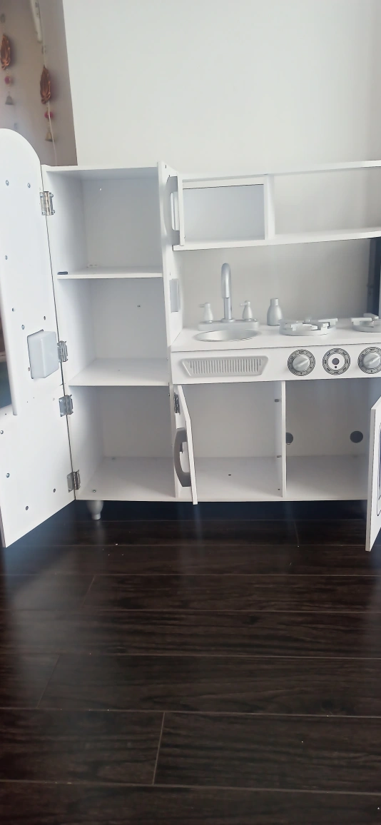Adorable white play kitchen, features a fridge, stove, oven, sink, and microwave. Lots of storage. Great for imaginative play.KidKraft Vintage Wooden Play Kitchen with Pretend Ice Maker. one gas nob &Play Phone missing, pls check pictures for missing parts.