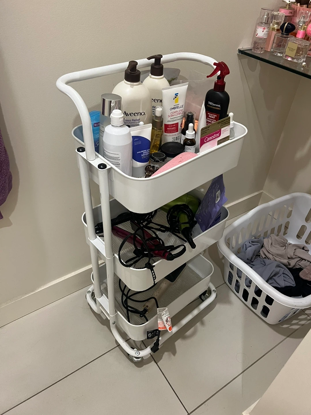 82Selling a handy white rolling cart! It's perfect for organizing your essentials in any room, whether it's for beauty products, toiletries, or even office supplies. One of the wheels is slightly stuck so it doesn’t roll as smoothly but it is still great for storage as a stationary cart and holds a lot of things. Pick up at Metrotown by october 31st 10am.