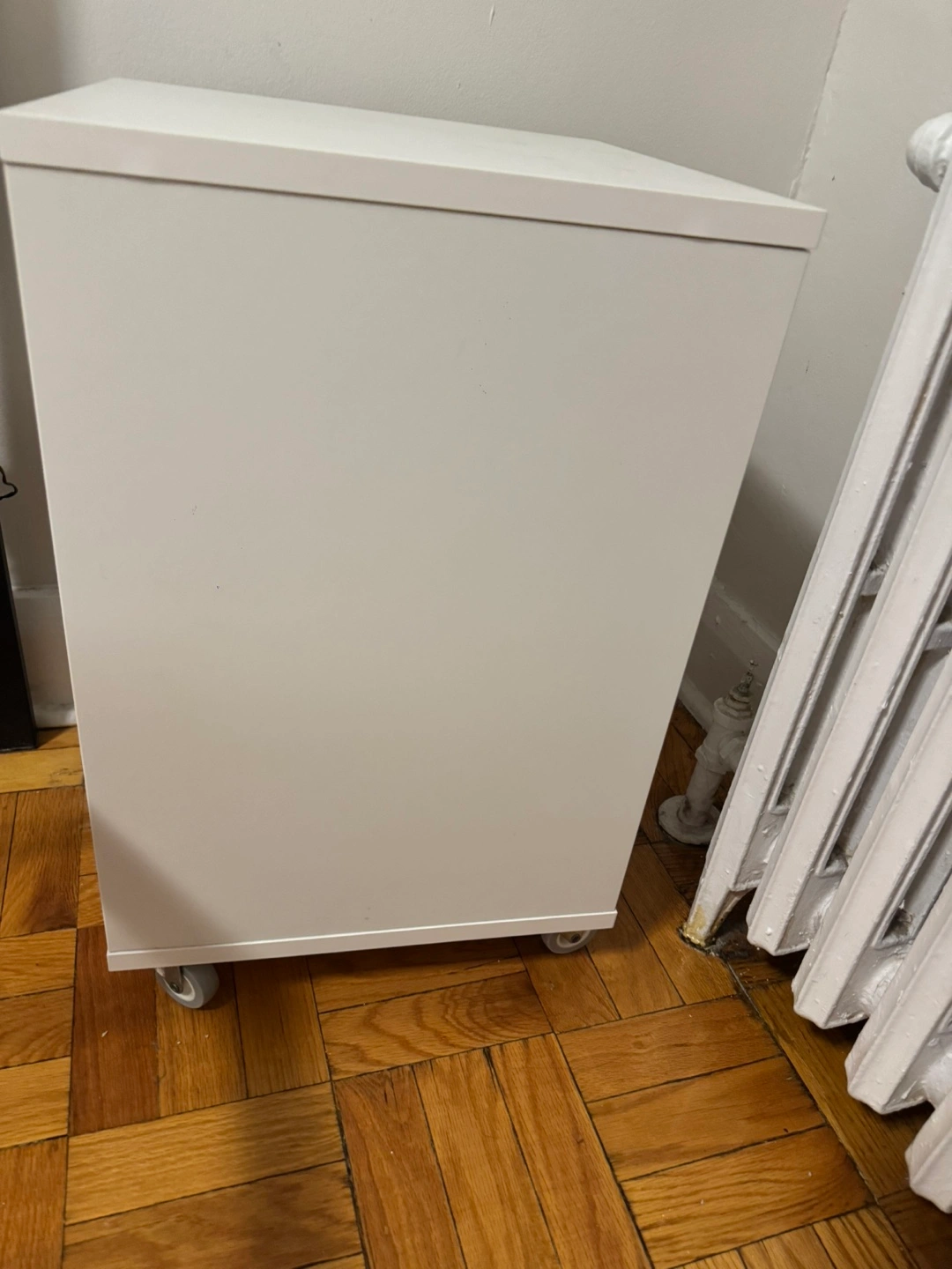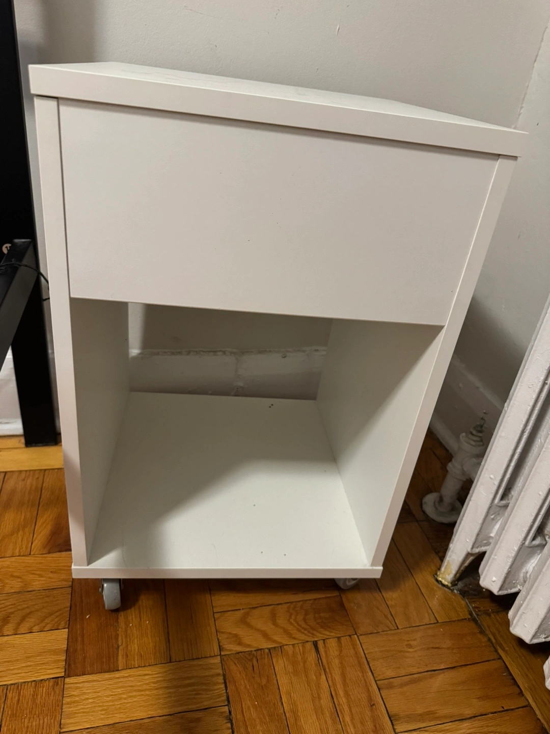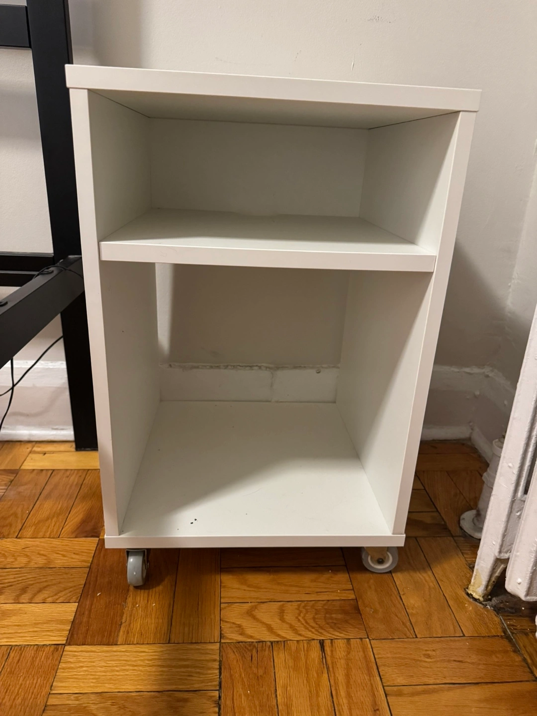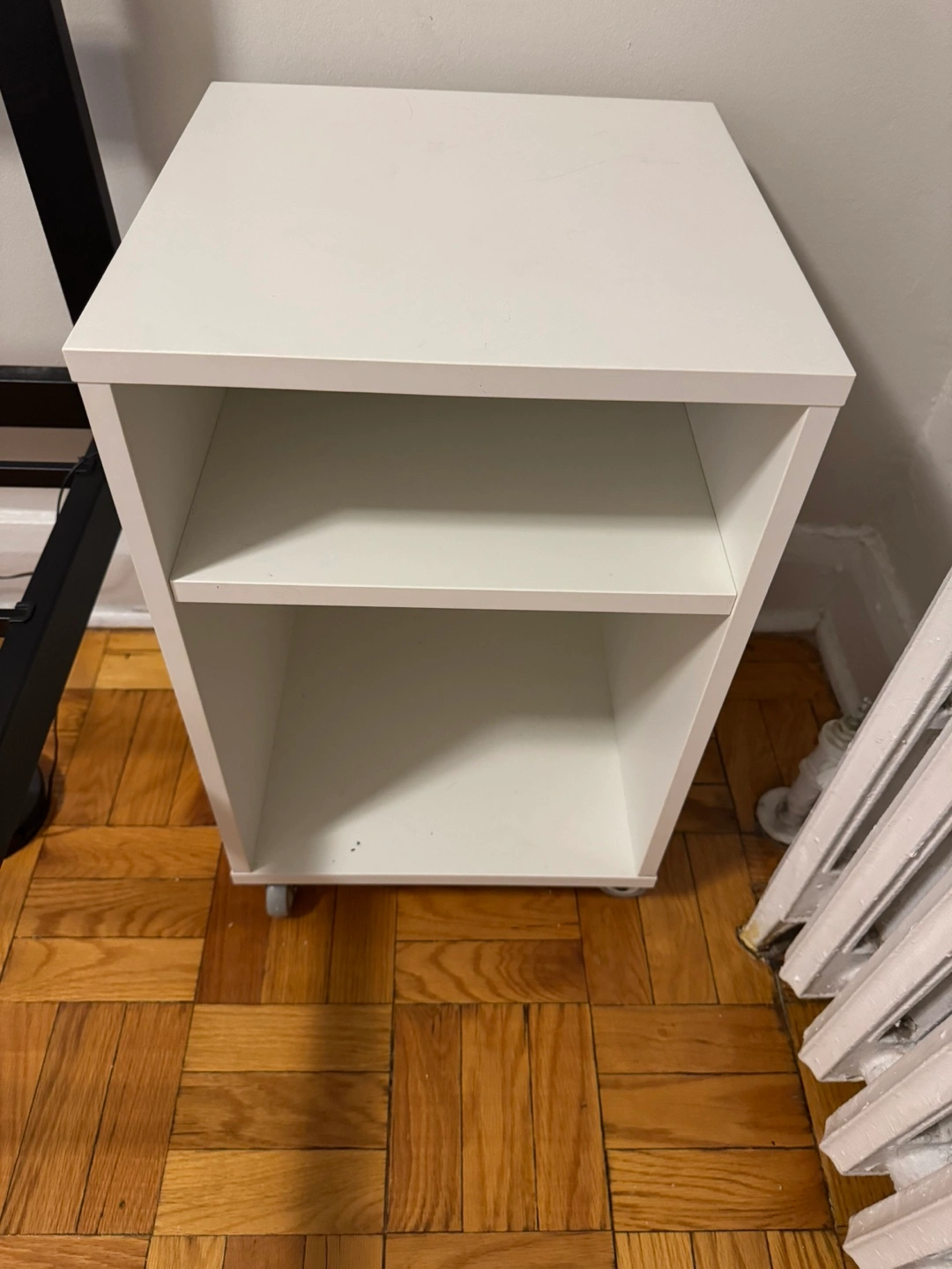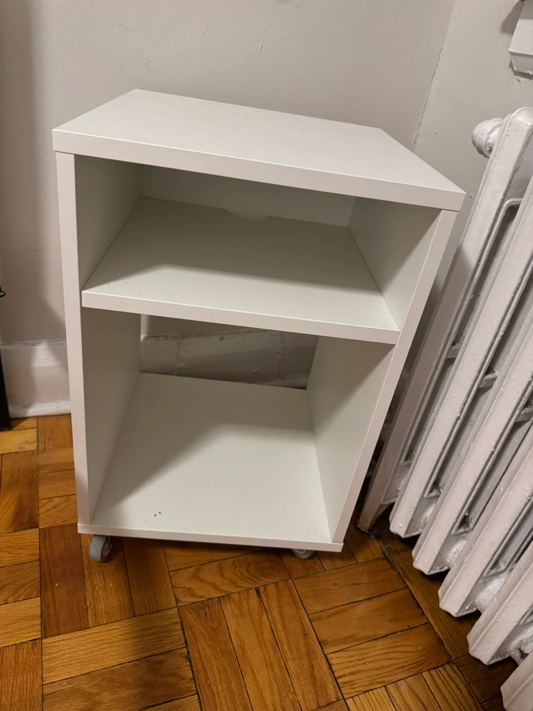 105Selling a handy little white shelf unit on wheels! It's perfect for adding some extra storage to a small space. It has an open design, making it easy to access your things. Great for a bedside table or a small storage unit