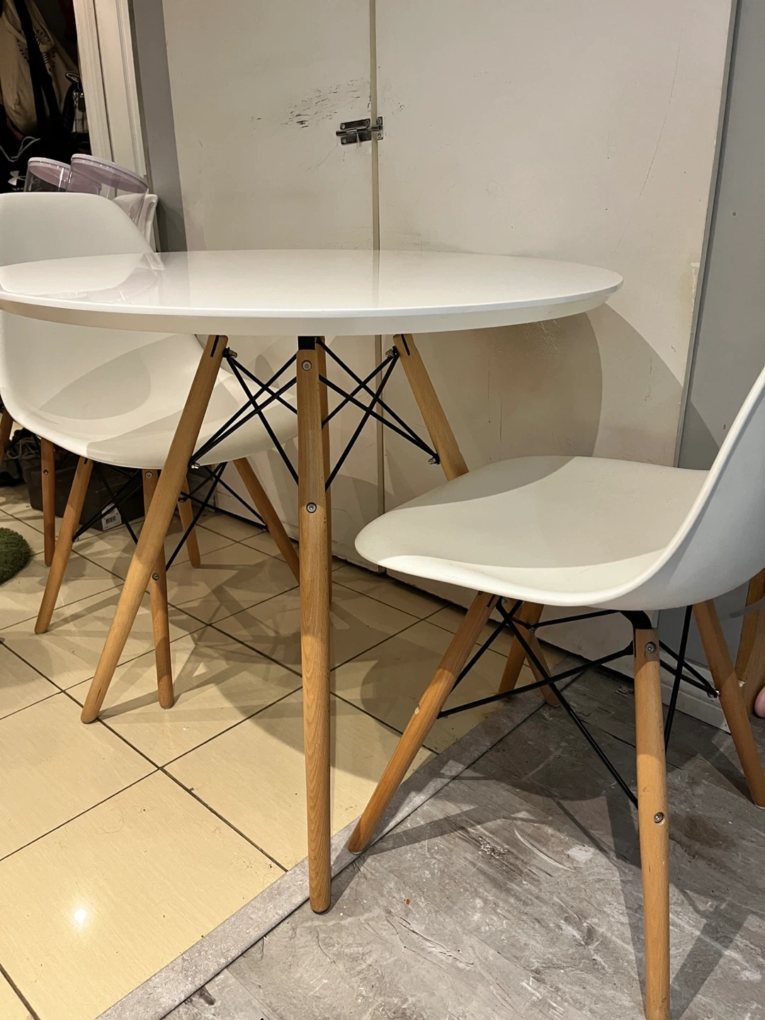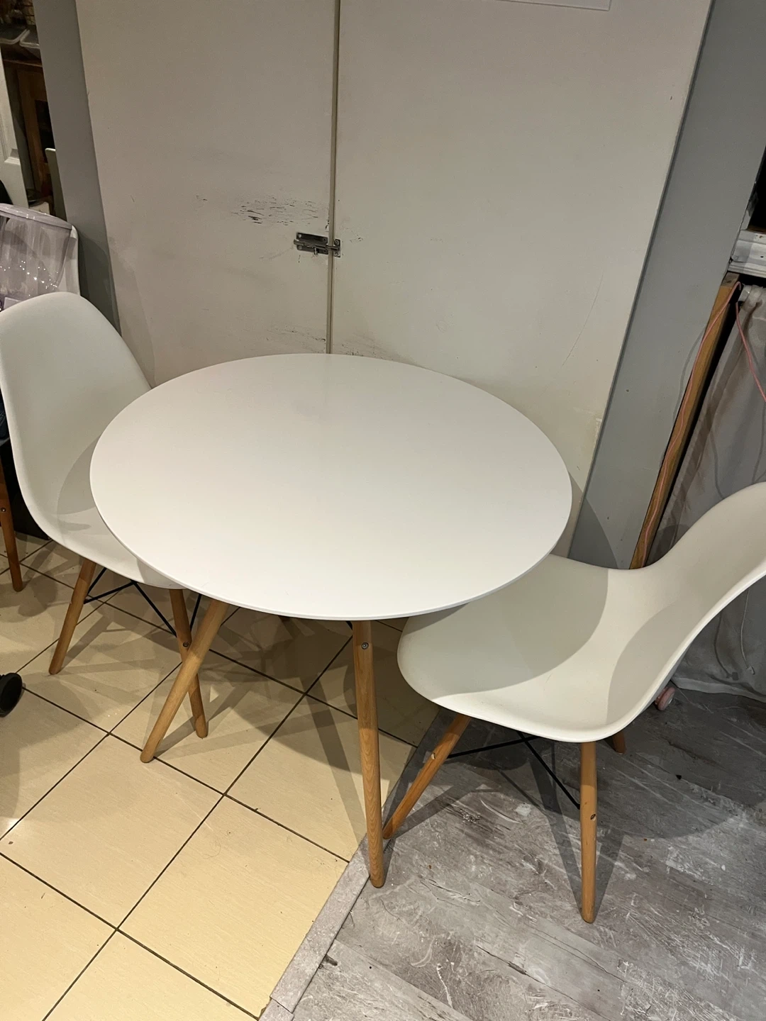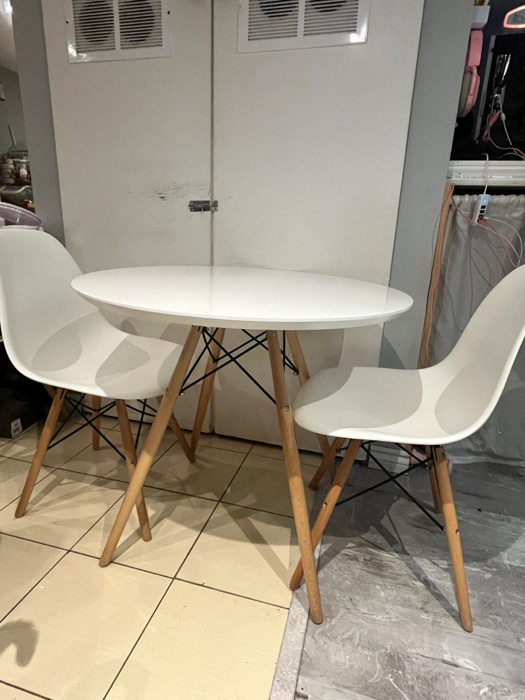 Round Lacquered Dining Table + 2 white chairs for $140 Width - 35inch / 90cm Height - 30inch / 76cm Depth - 35inch / 90cm This table can be used as a dining or can be used outdoors as well. There is a small nick (see picture) on the top but it’s not as noticeable. Selling it because we’re moving. PICK UP ONLY (Lansdowne & Dupont area) Note: The round top will be disassembled from the legs, I’ll give you the screws to put it on but it’s pretty simple to attach again.