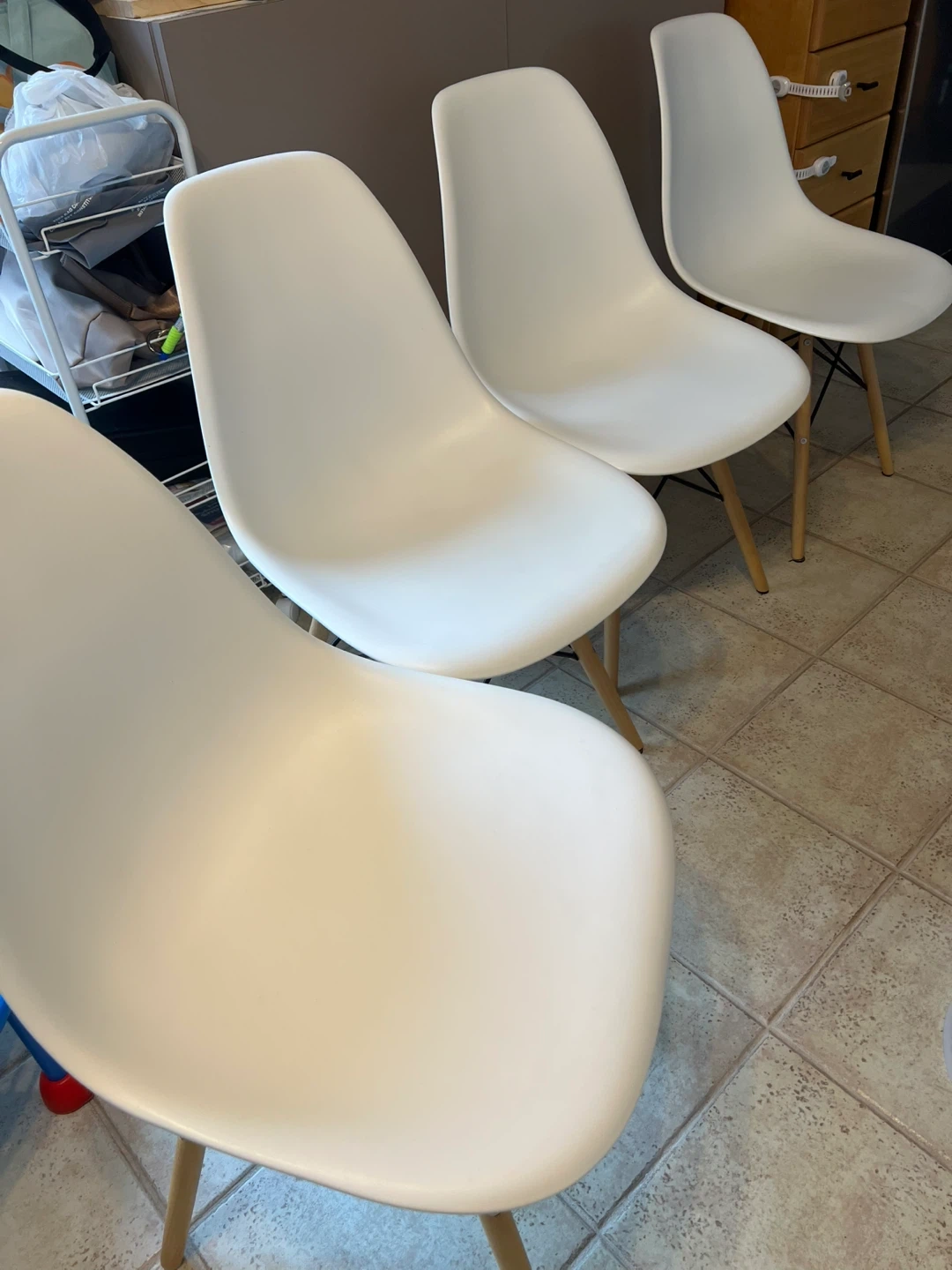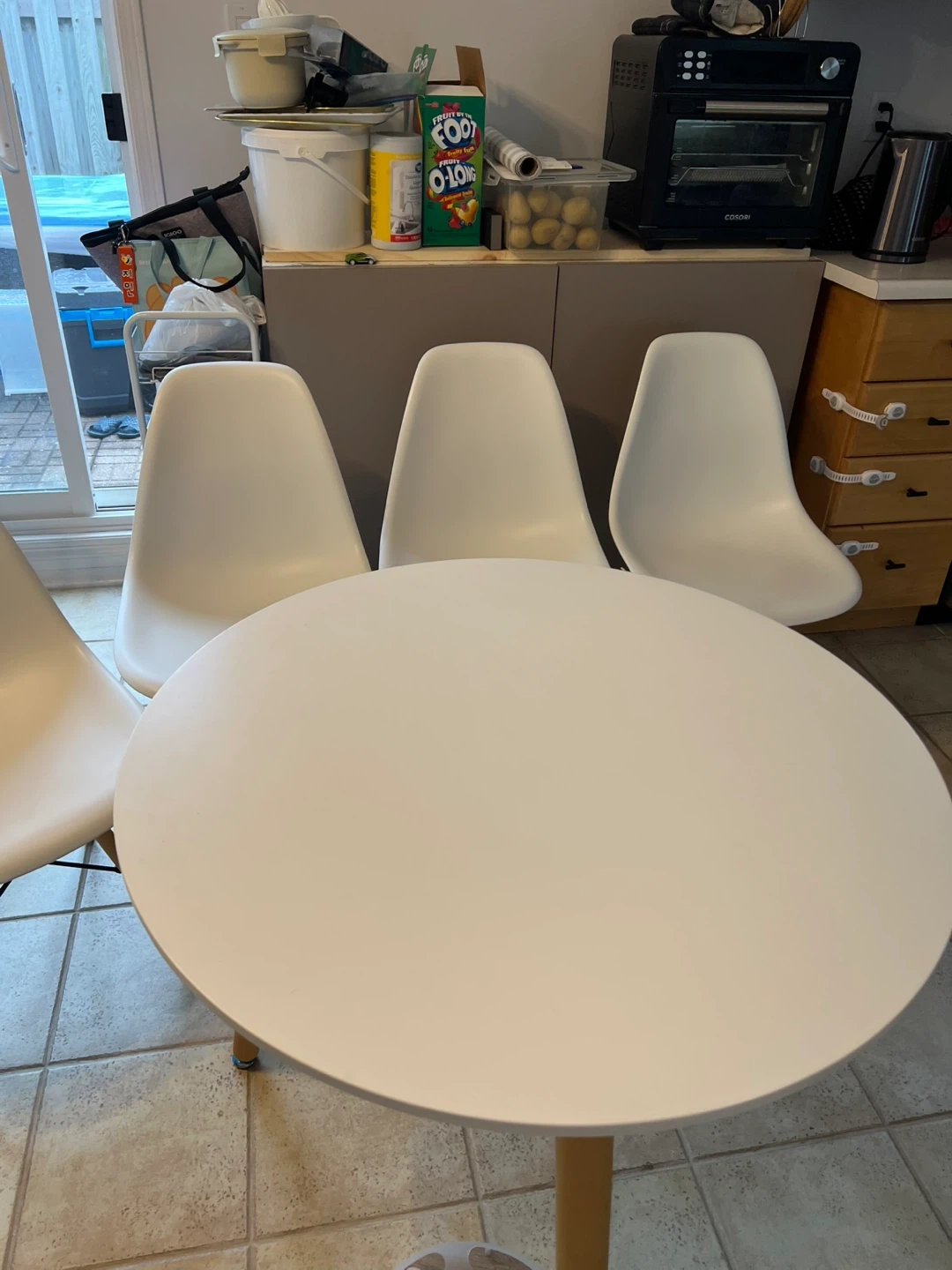 Selling a round white table and 4 eiffel chairs Chair - $25 each Table - $20 Set - $110 Table can only fit 3 chairs and has a minor cosmetic damage Smoke free cat friendly home Pick up only