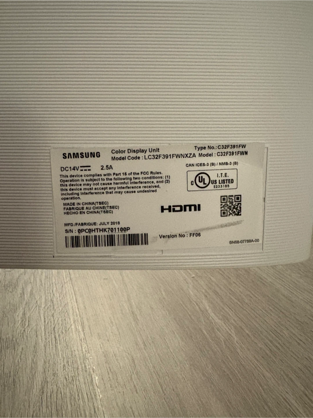 100I'm selling my monitor that has been taken care of very well! I've had it for a few years and just don't use it anymore. It can be used for gaming, office work, etc. Can even be used as a small TV. ! PICKUP ONLY ! Details below: Model: Samsung C32F391FW (Series F391) Screen size: 32 inches Panel type: VA (Vertical Alignment) Resolution: Full HD (1920 × 1080) Refresh rate: 60 Hz Aspect ratio: 16:9 Curvature: 1800R (moderate curve) Inputs: HDMI, DisplayPort Power: DC 14V, 2.5A