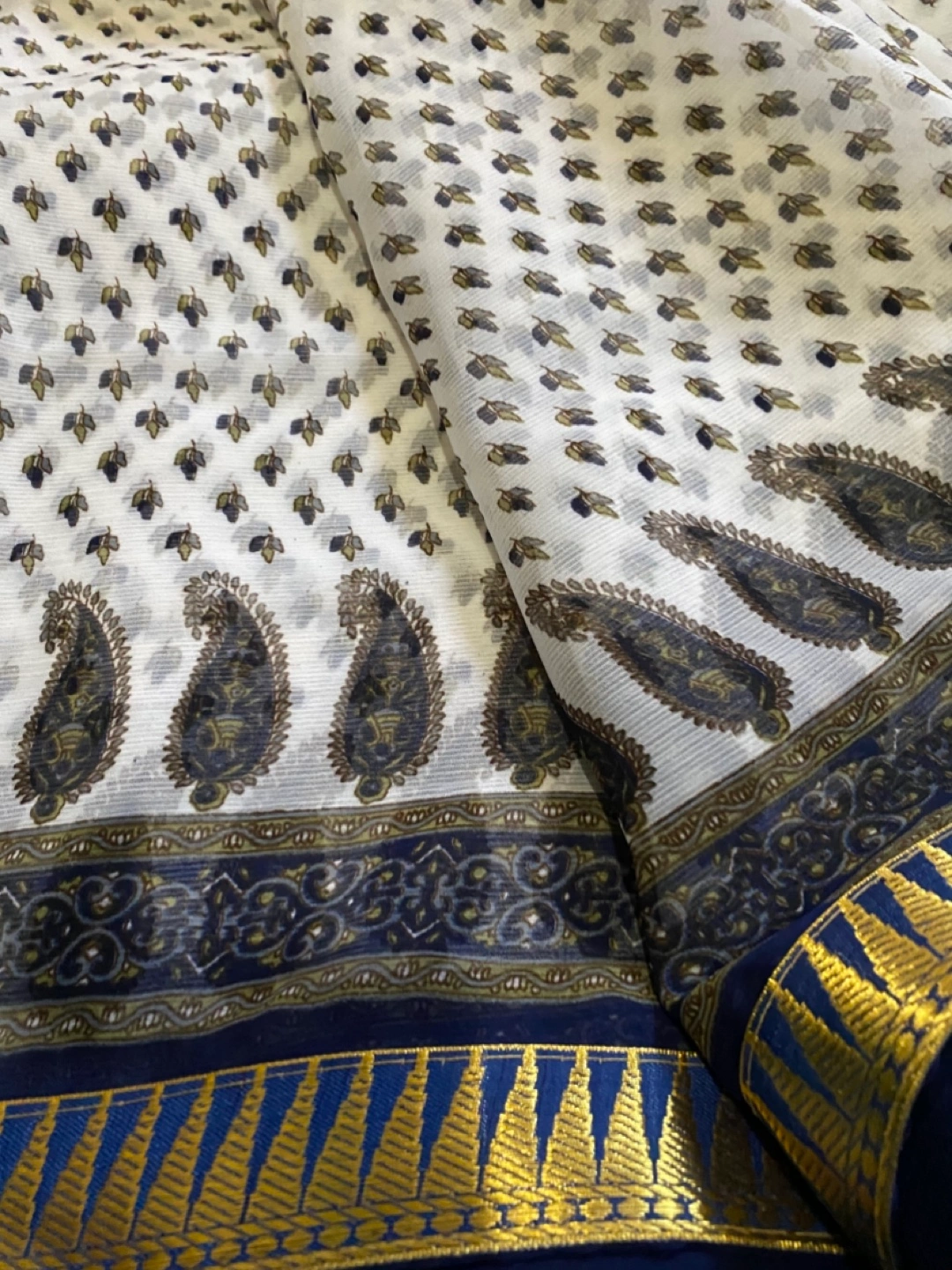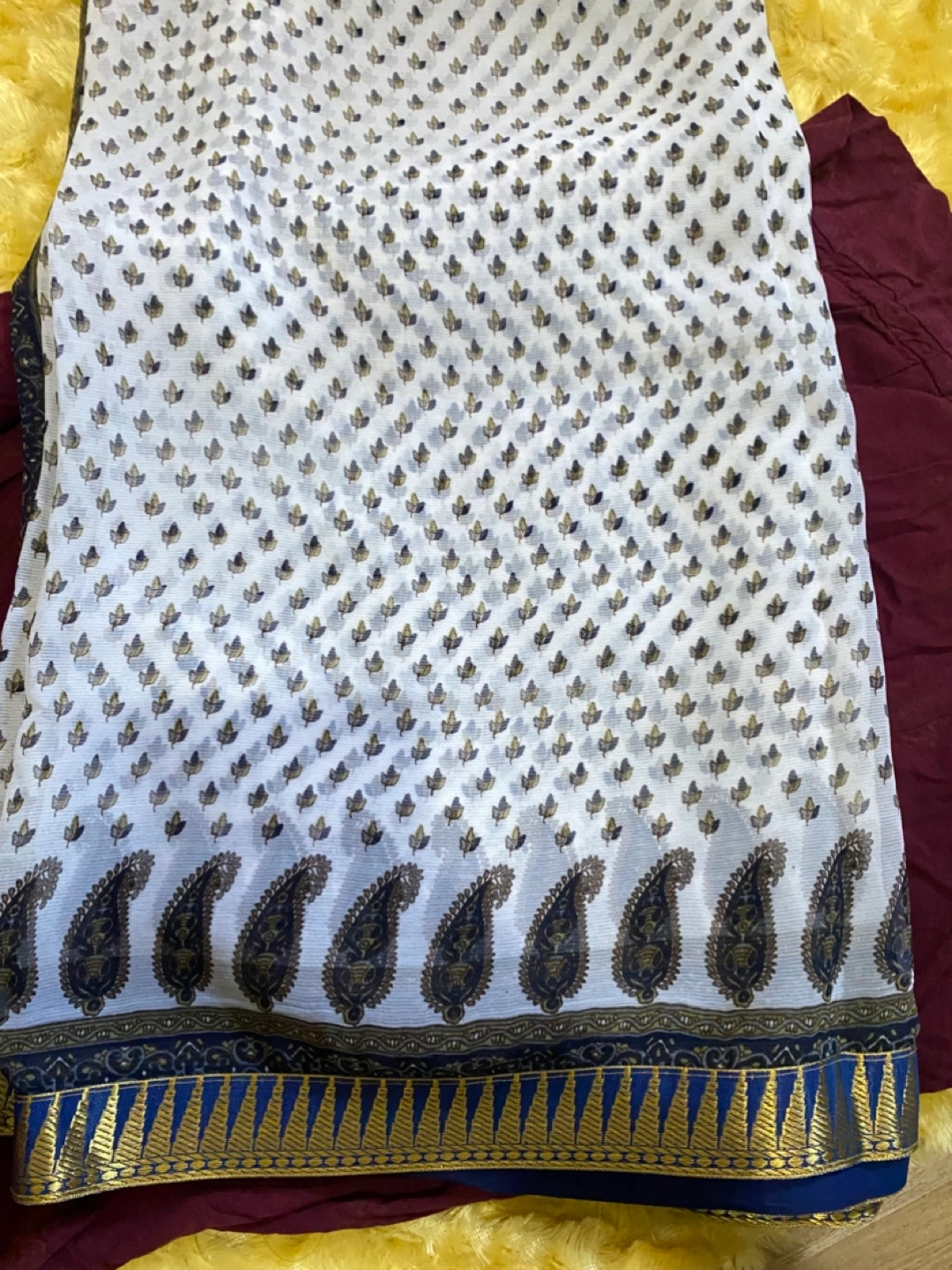 Beautiful white saree featuring a classic paisley pattern and a striking blue and gold border. This sari is perfect for adding a touch of elegance to any occasion. The material feels lightweight and comfortable