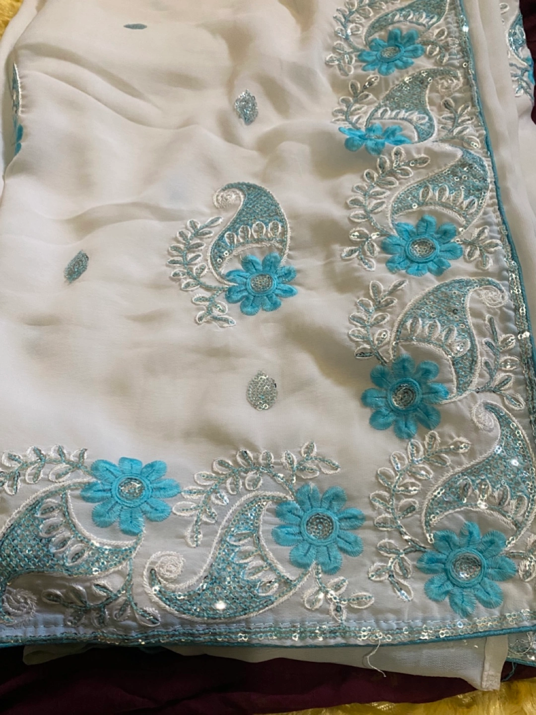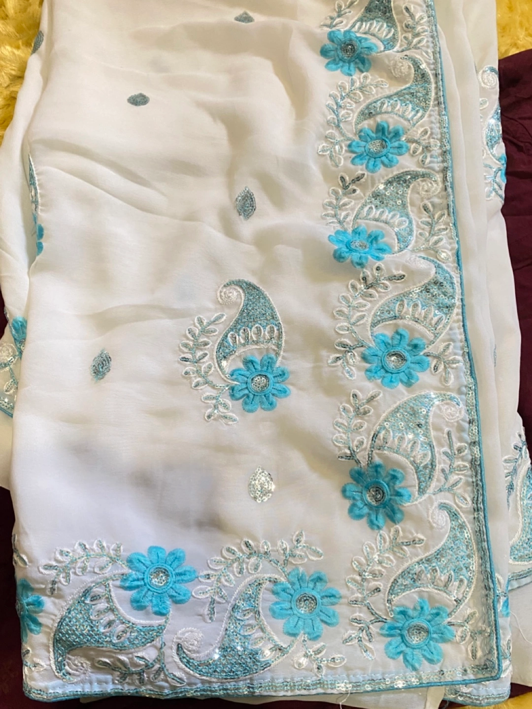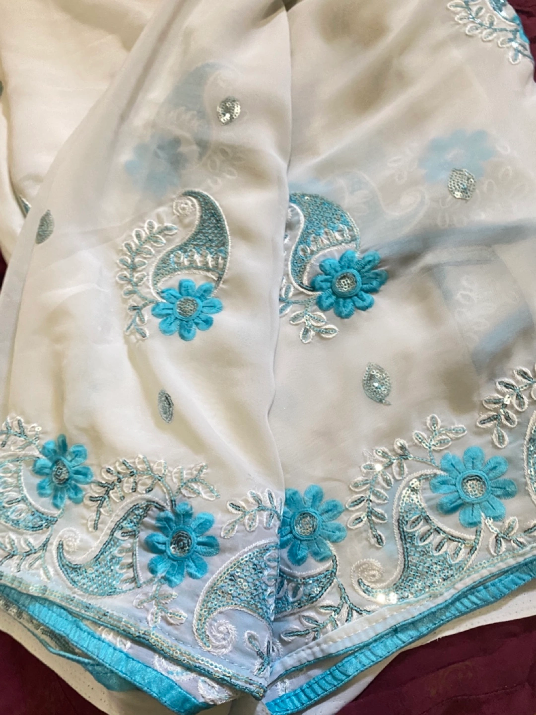 Beautiful white saree featuring delicate blue floral and paisley embroidery. The fabric is lightweight and flowy, perfect for special occasions or everyday wear. The intricate detailing adds a touch of elegance to this traditional garment. It's in great condition and ready for a new home!