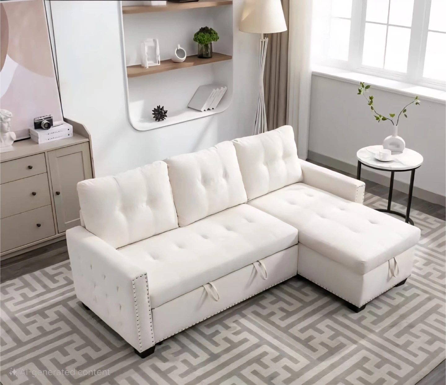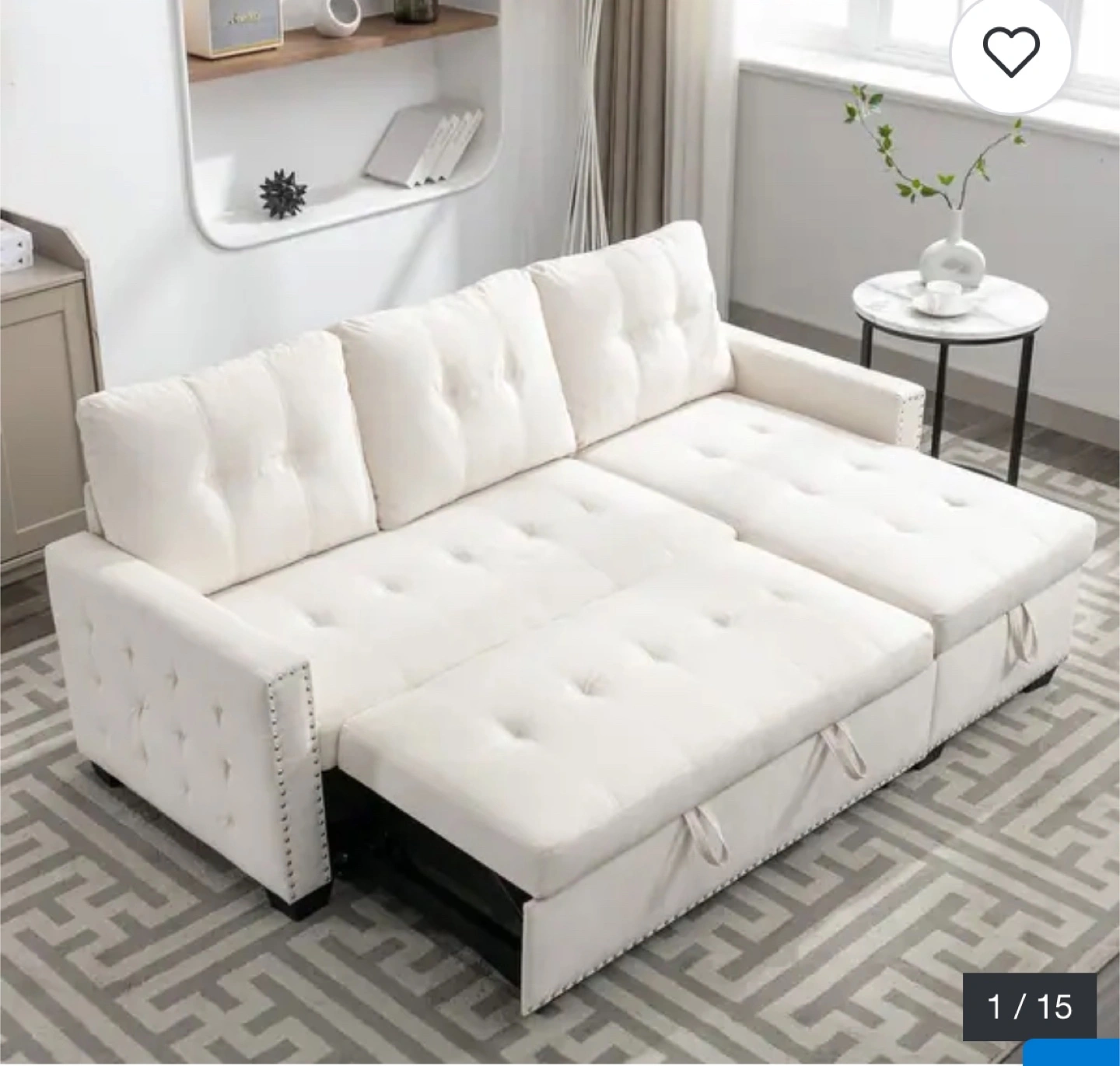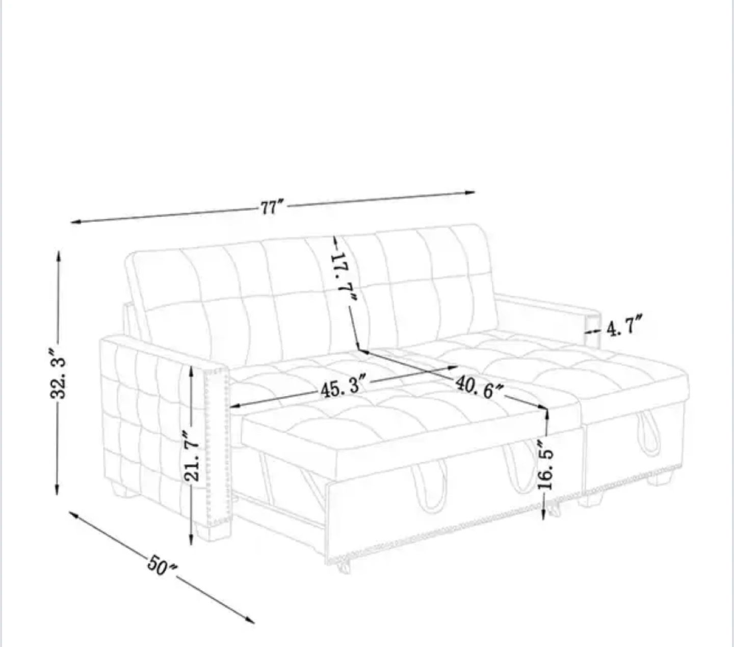 Details: Product Features Products Size (L*W*H) :76.8'' *50'' *32.3'' Weight : 136.7 lbs Functional : Pull out sleeper +Storage chaise+Removable cushions Design: Reversible Storage Sleeper bed ,beautiful arm design , Foam Filling : D28 Foam Cover material : Skin-Feeling Velvet Fabric Easy assembly : You can assemble our sofa sleeper easily and quickly, It would only take you about 10 minutes or less. Easy to clean and avoid prolonged direct sunlight. Wipe the surface of the sofa cover with a slightly damp cloth to clean it up. 77 Inch Reversible: 77 Inch Reversible Sectional Storage Sleeper Sofa Bed,2 seats with big storage chaise.It can be used as an ordinary sectional Sofa with a large capacity storage, also as a guest bed. Description Arm:Arm with studs design Pillow:Pillow very confortable and soft Seat:Seat detail Chaise:Storage chaise Product Dimensions Assembled Length (in.):76.80 Assembled Width (in.):50.00 Assembled Height (in.):32.30 Weight (lbs.):136.70