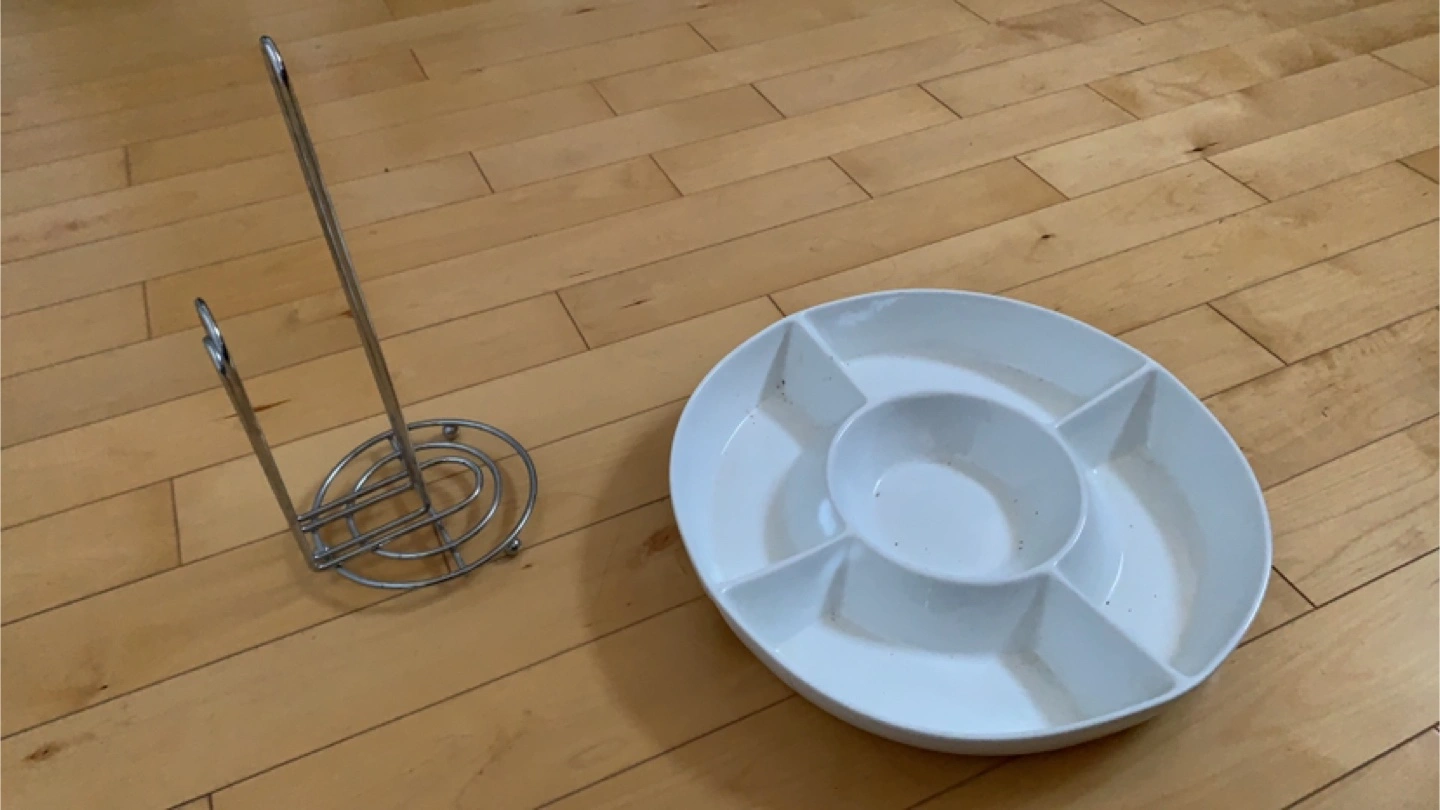 68Selling a white serving platter, perfect for snacks or appetizers! It has a central dip bowl and divided sections. Also included is a metal napkin holder to complete your serving set