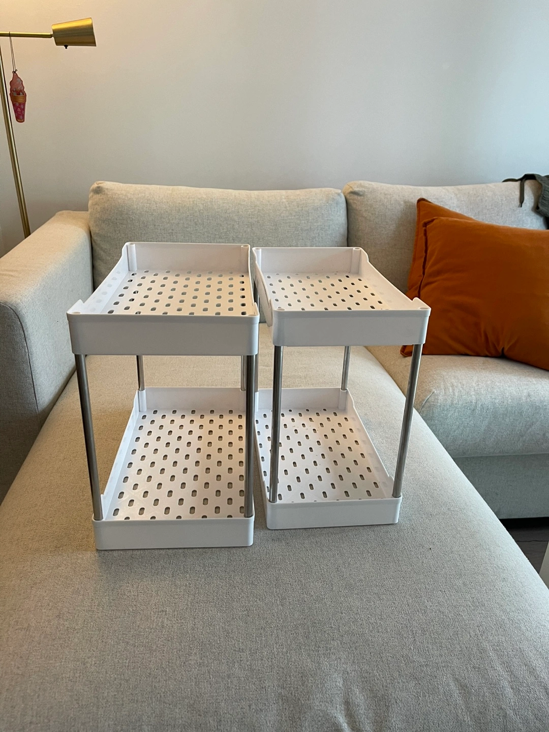 Selling a set of two shelf units in white! These are great for adding some extra storage in small spaces, like bathrooms or kitchens. They're in excellent condition and ready for a new home. Lightweight and easy to assemble!