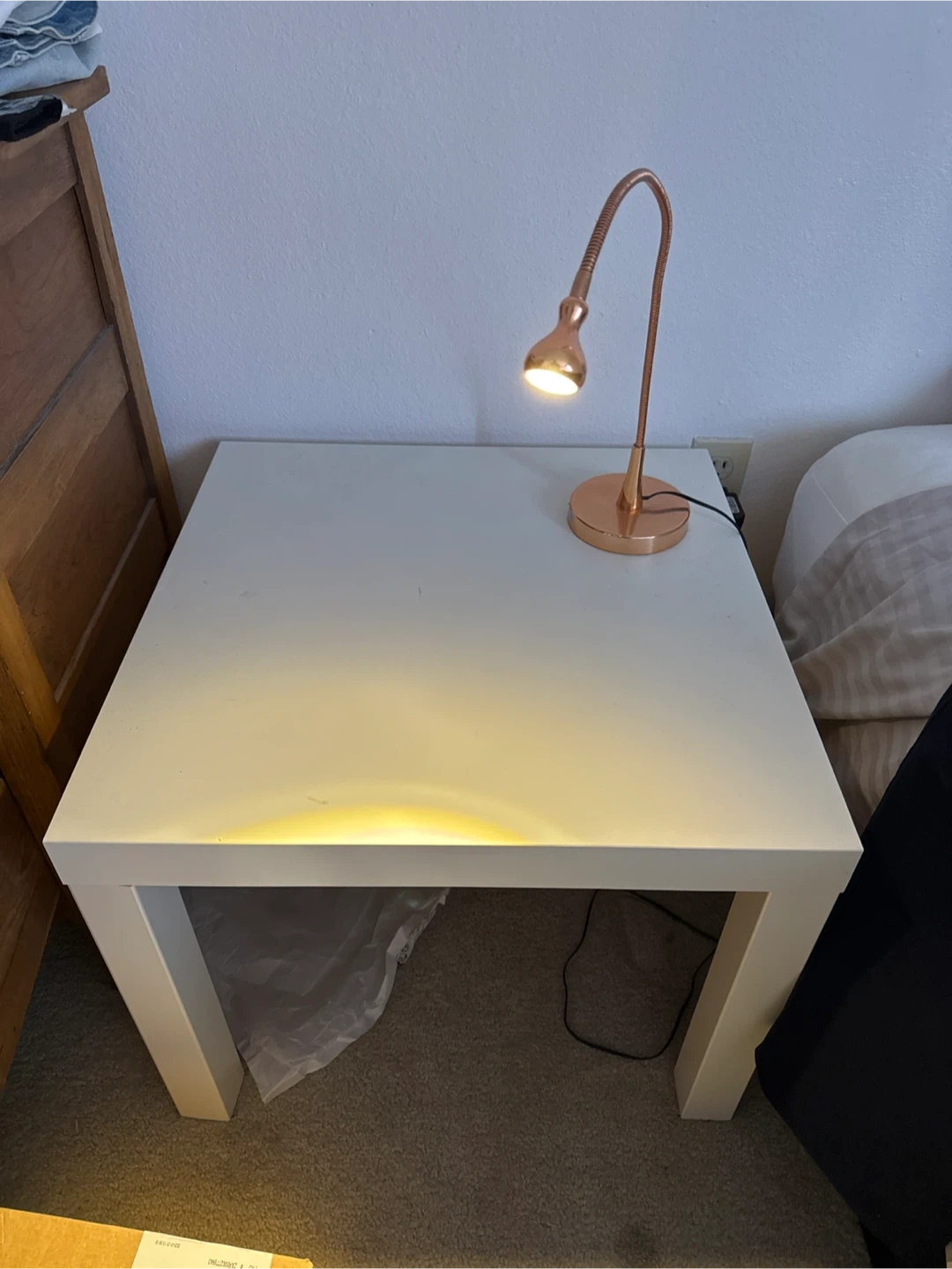 60Selling a simple white side table! It's in great shape and would be perfect next to a bed or sofa. Also included is a stylish copper-coloured desk lamp that complements the table nicely