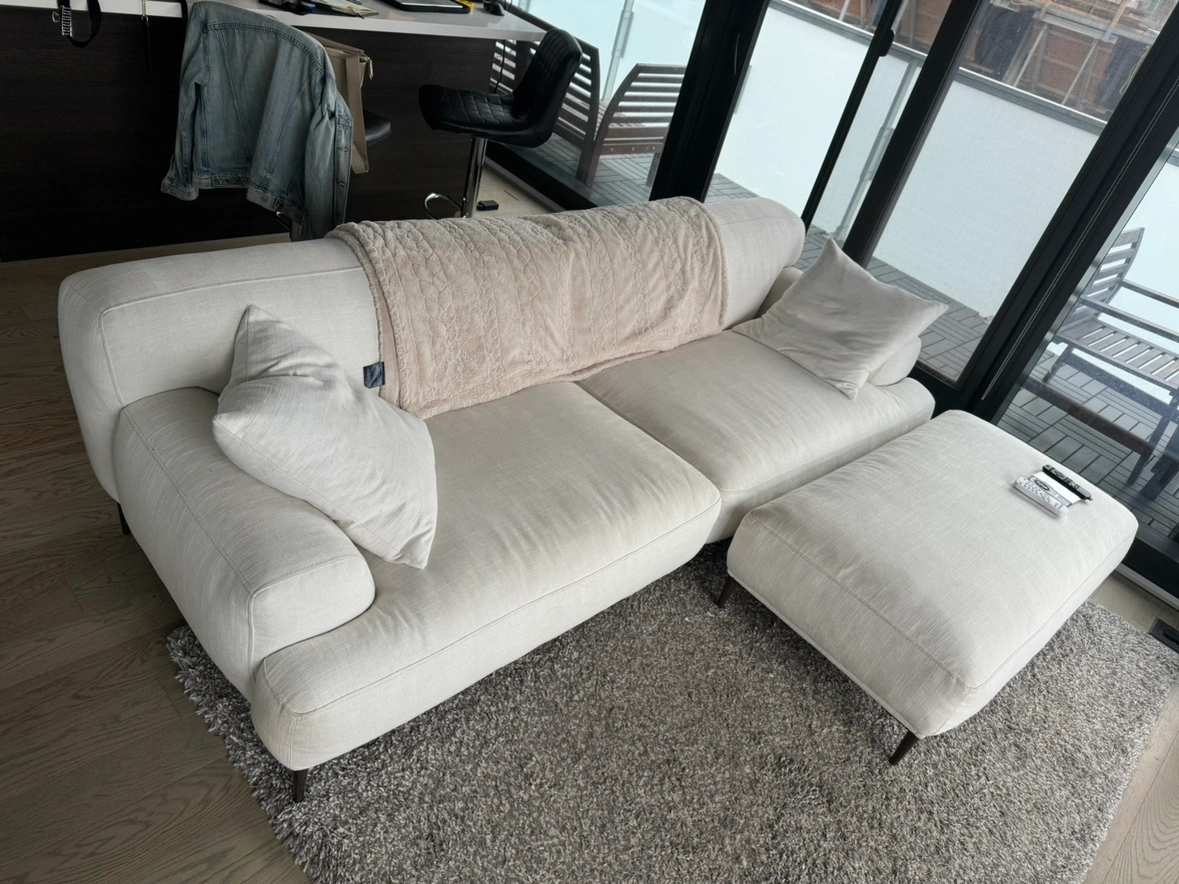 15Sofa: https://www.article.com/product/22596/abisko-91-sofa-quartz-white?queryID=e8bc8b27383f92b6ac96f58976f43fcb&index=production_product Ottoman: https://www.article.com/product/21825/abisko-45-5-ottoman-quartz-white Purchased brand new in April 2023. Two pillows are included. Available for pick-up only.