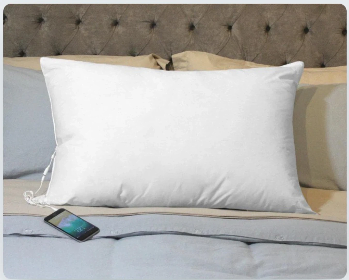 Description Let yourself be carried away into sleep by the calming sounds of music. The innovative, new Music Sleep pillow is the ultimate in sound therapy. A high-quality, built-in speaker sits inside a soft, breathable pillow that’s ready for a good night’s sleep. Filled with polyester for maximum comfort, this bed pillow is hypoallergenic. Enjoy music or meditation as you drift off to sleep. Works with Apple, Android, and Windows phones. *Please note that iPhone 7 and higher require a separate adaptor that is not included. The ultimate sound therapy High-quality built-in speaker Soft & breathable pillow shell Polyester fill for maximum comfort Works with Apple, Android and Windows phones Spot clean only Shell: 100% Polyester Fill: 100% Polyester Fill Weight: S/23z, Q/26oz, K/32oz Includes: Bed Pillow for 200$ each Pillow protector for extra 20$