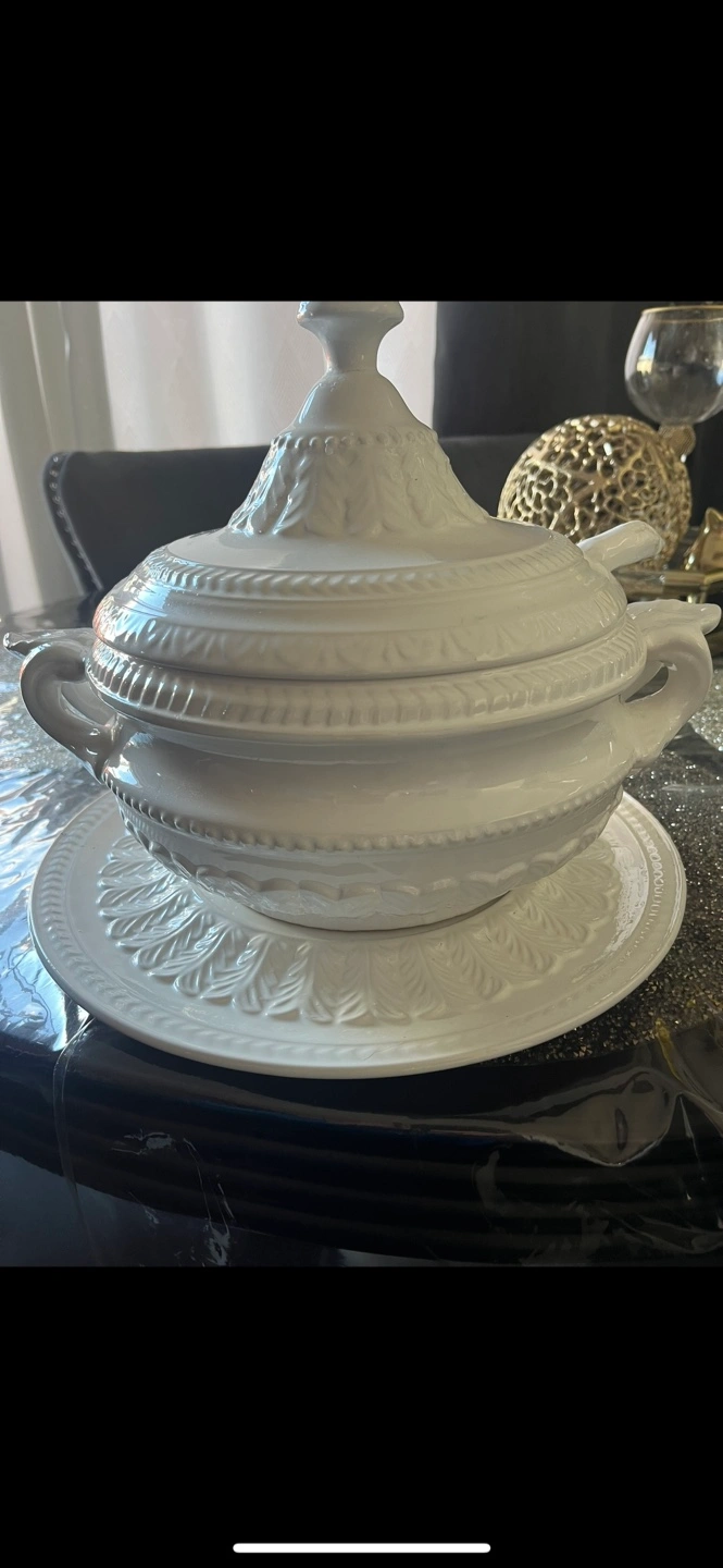 Soup tureen in white ceramic. Includes a lid and a small ladle. The piece rests on a matching plate. Enjoy some soup on a cozy evening.