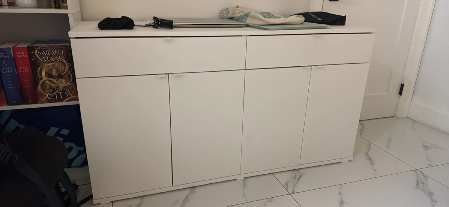18Clean white cabinet. Several doors and drawers. Great for storing things. My friend bought it few months ago. selling it because she moved and could not take it along