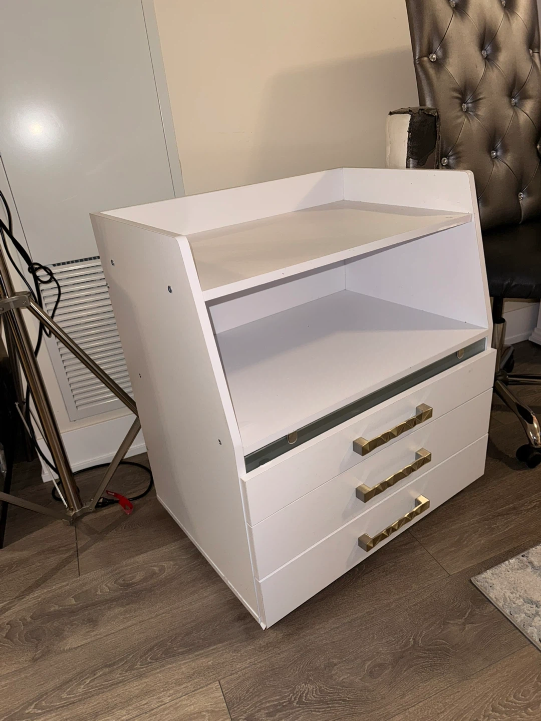 10Velmi beauty salon / vanity storage station in very good condition imported and handmade from Ukraine. Sturdy and super functional for a beauty room, bedroom, or professional space. Retails for 500 euros. ✅ Two open shelves, great for hair tools, skincare, makeup organizers, towels ✅ Three smooth-glide drawers with chrome geometric handles ✅ Strong top shelf surface for workstation items ✅ Clean white finish, fits glam, modern, or minimalist décor ✅ Fully assembled & ready to use Perfect for: • Hair stylists • Makeup artists • Nail techs • Bedroom vanity storage • Small spaces needing stylish organization Smoke-free, pet-free home. Pickup in Vaughan 🚗 💲 Asking $180 OBO - open to reasonable offers!