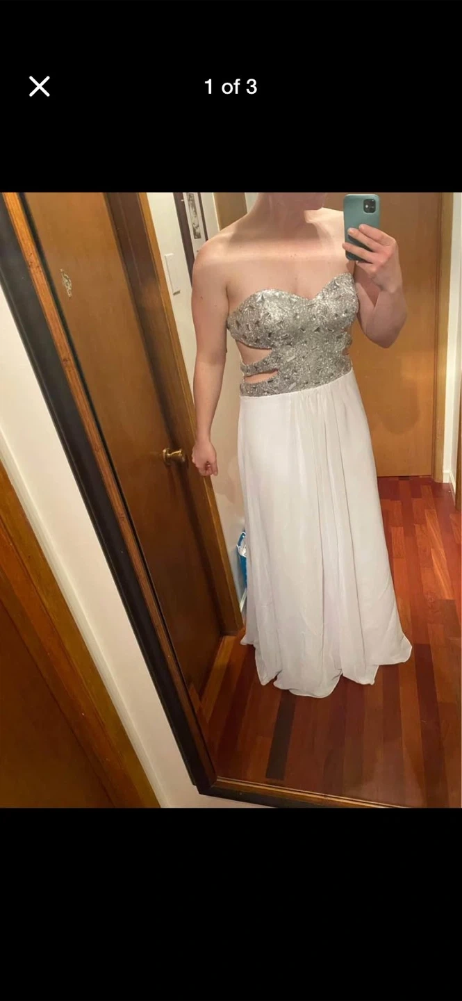 111Selling a beautiful white strapless formal dress with sequin detailing on the bodice. It features cut-out accents and a long, flowing skirt. Perfect for a special occasion! Only been worn once at an indoor event. Dress is a size 12