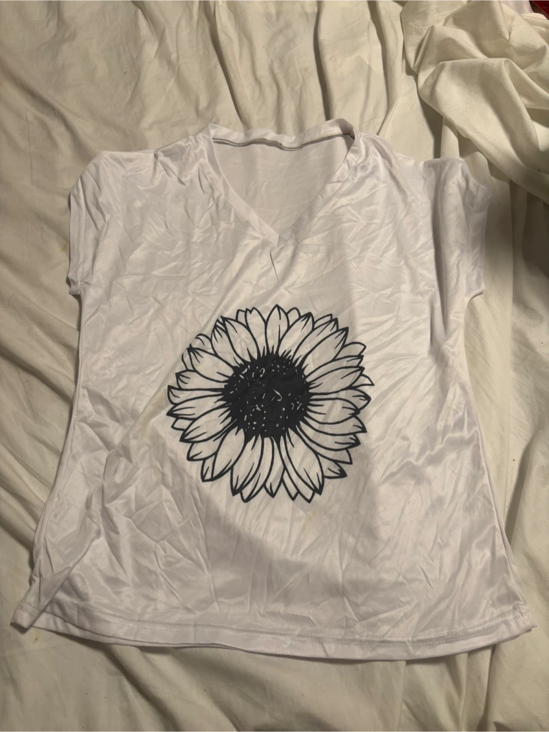 25Here's a white t-shirt with a sunflower design. It's in used condition, but still has lots of life left!
