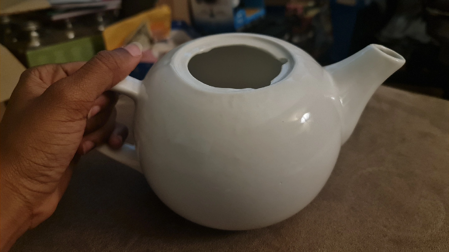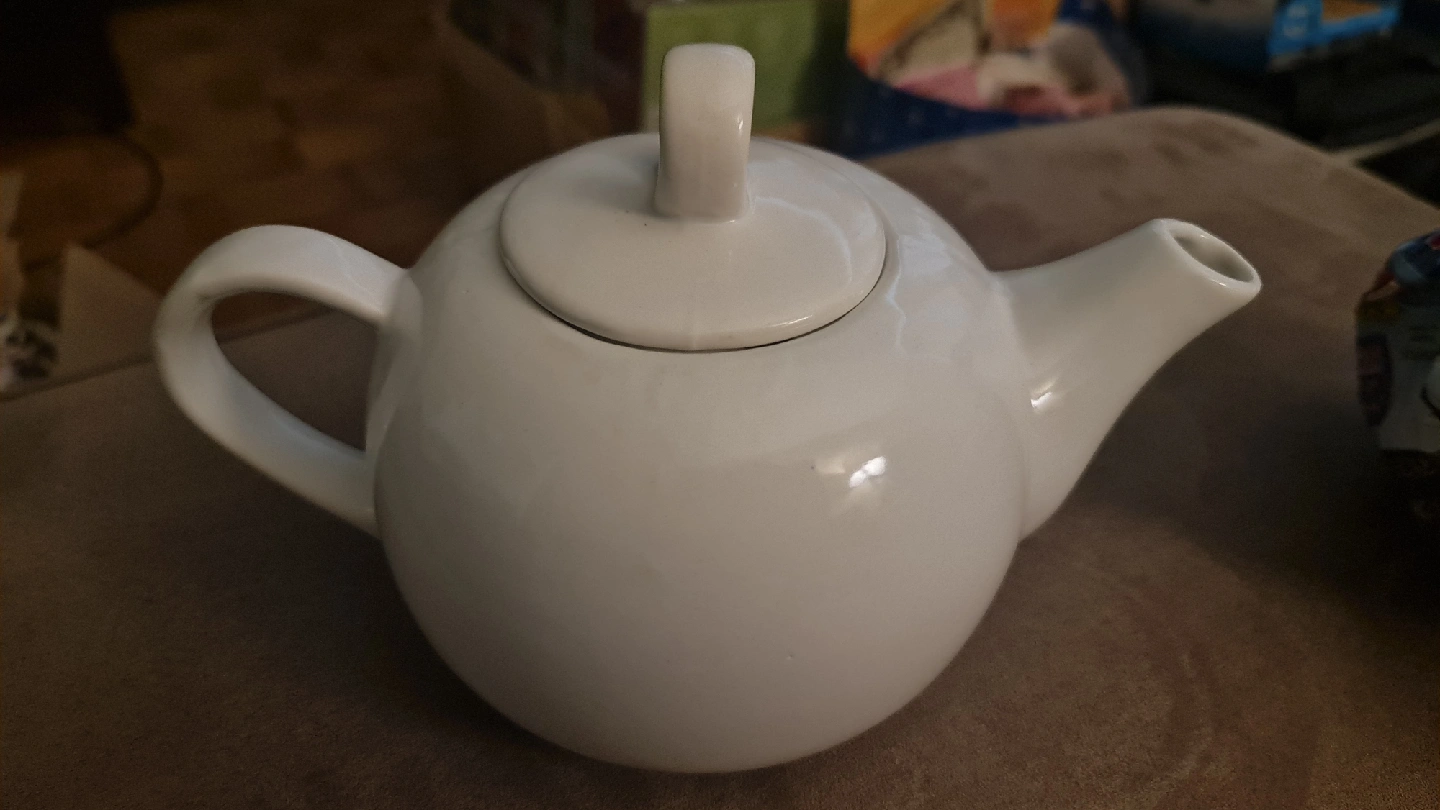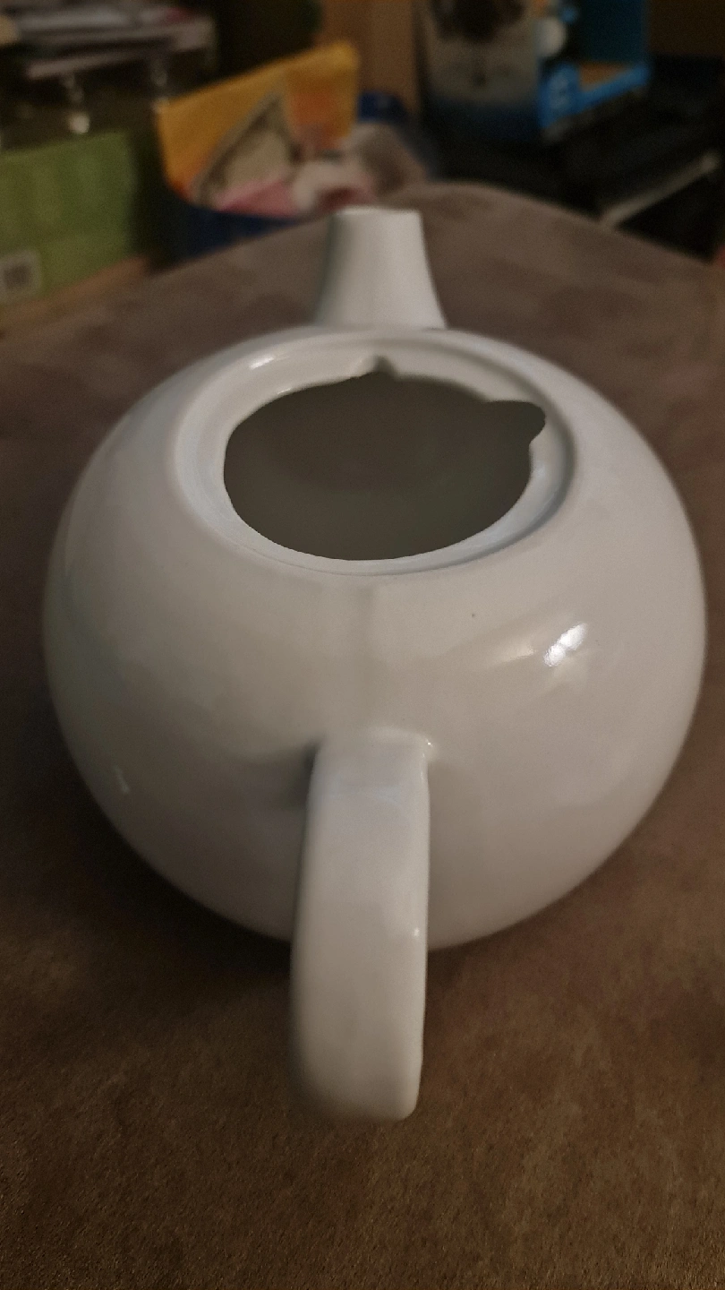 86Lovely white teapot with a small chip in the top opening. I don't want to throw it aeay but it is chipped as you can see. I need to get rid of it however. FREE TEA POT