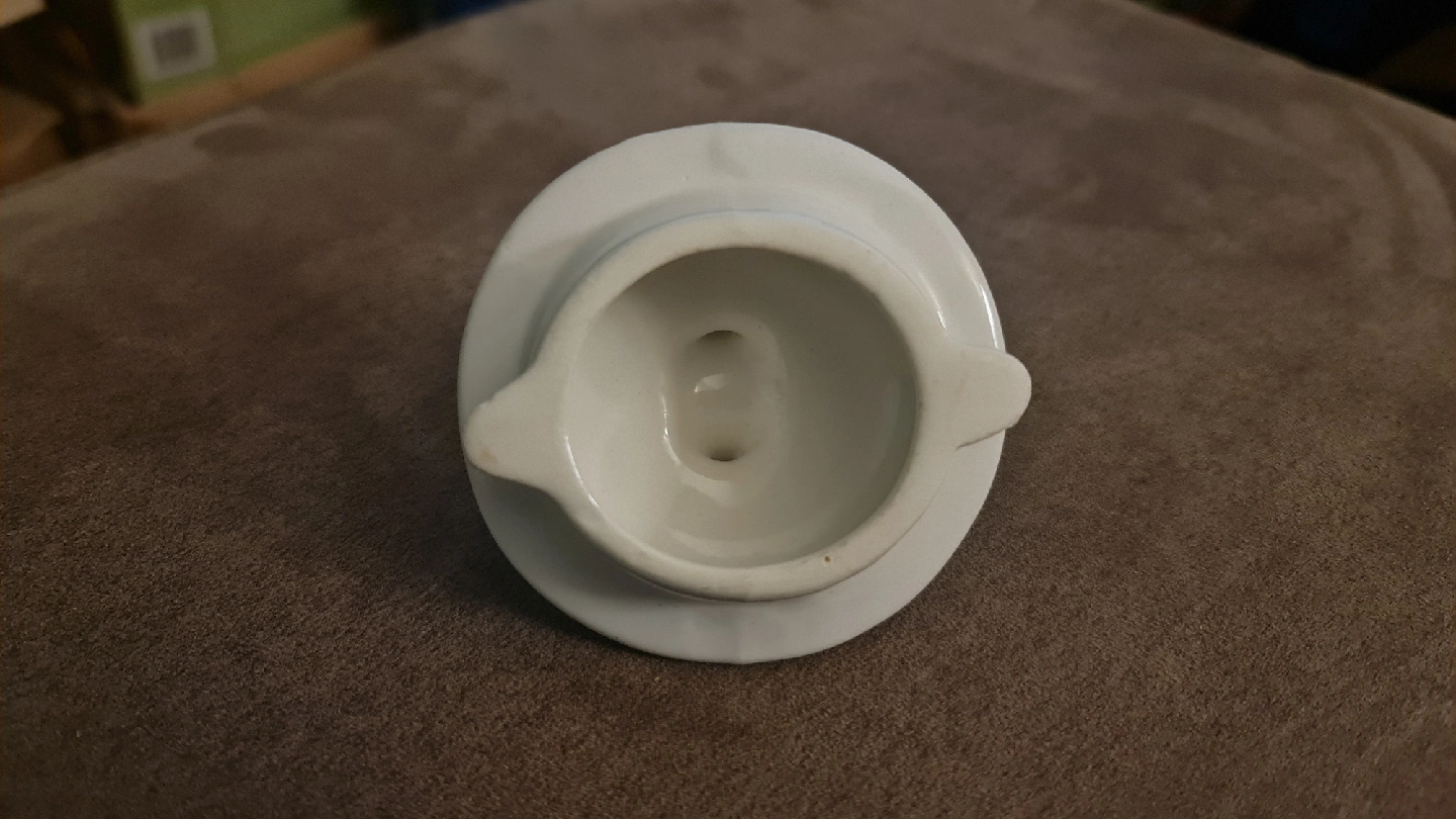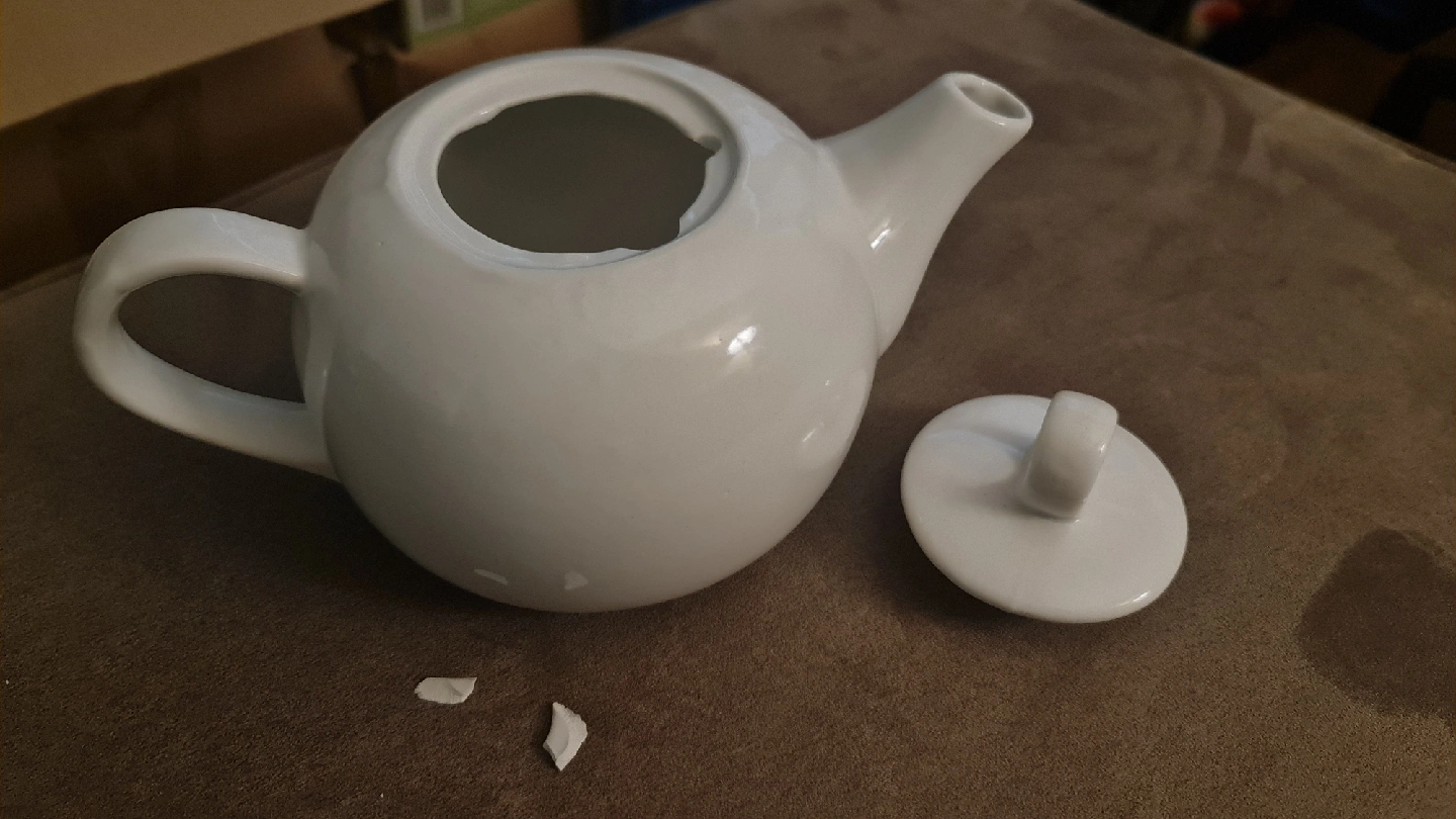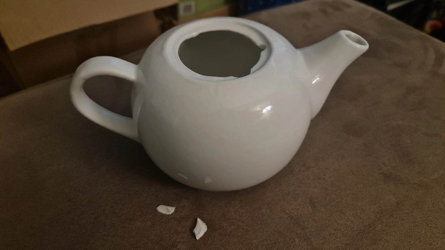 86Lovely white teapot with a small chip in the top opening. I don't want to throw it aeay but it is chipped as you can see. I need to get rid of it however. FREE TEA POT